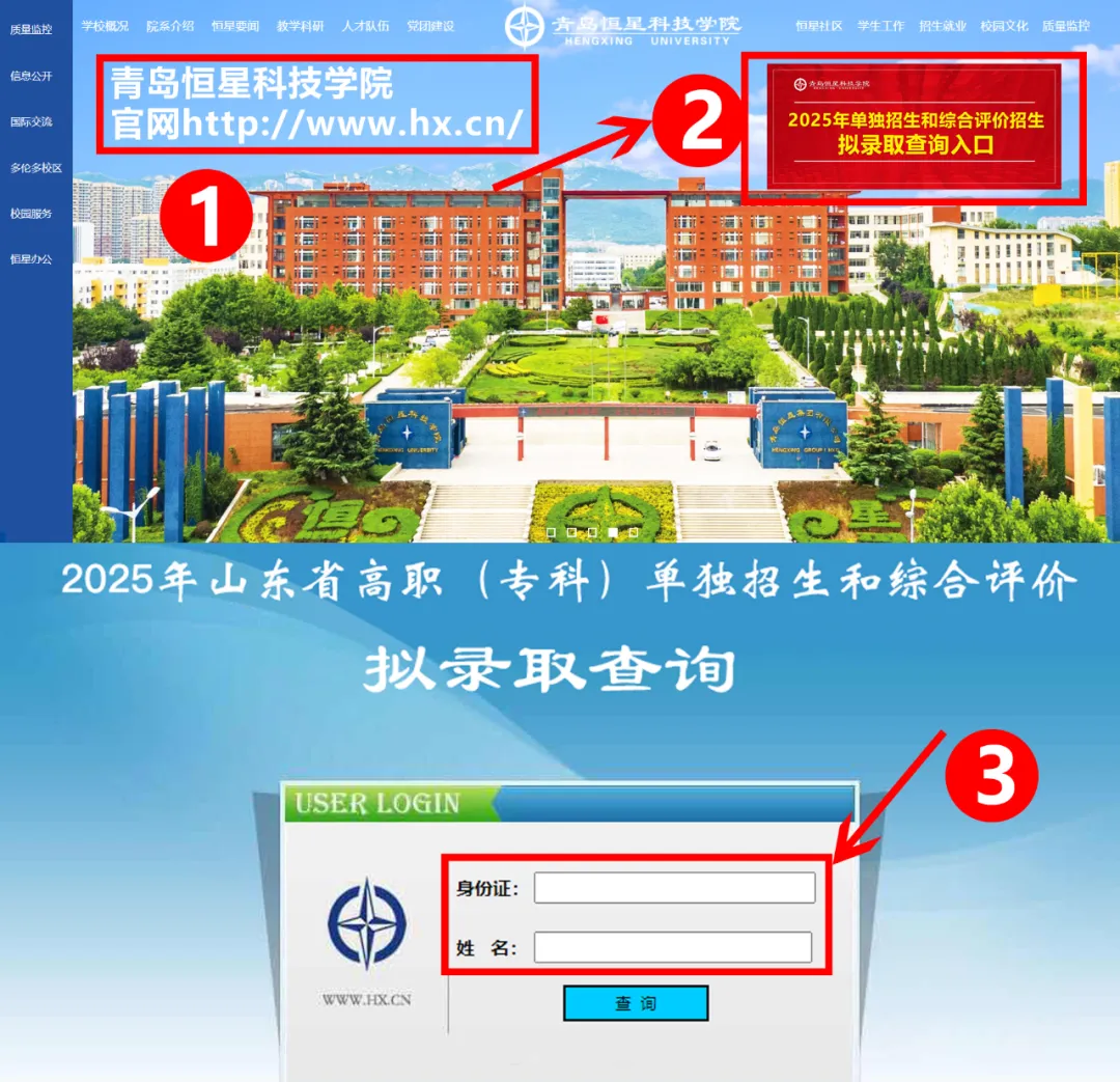 登录青岛恒星科技学院官网(http://www.hx.cn/)--点击飘窗--输入“姓名”和“身份证号”--查询