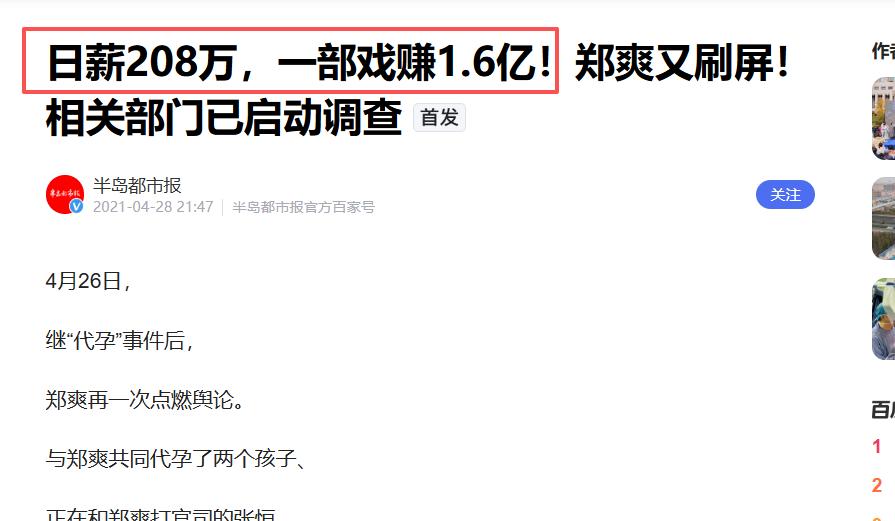 日薪208万,一部戏赚1.6亿!郑爽又刷屏!相关部门已启动调查半岛都市报 2021-04-28 21:47半岛都市报官方百家号