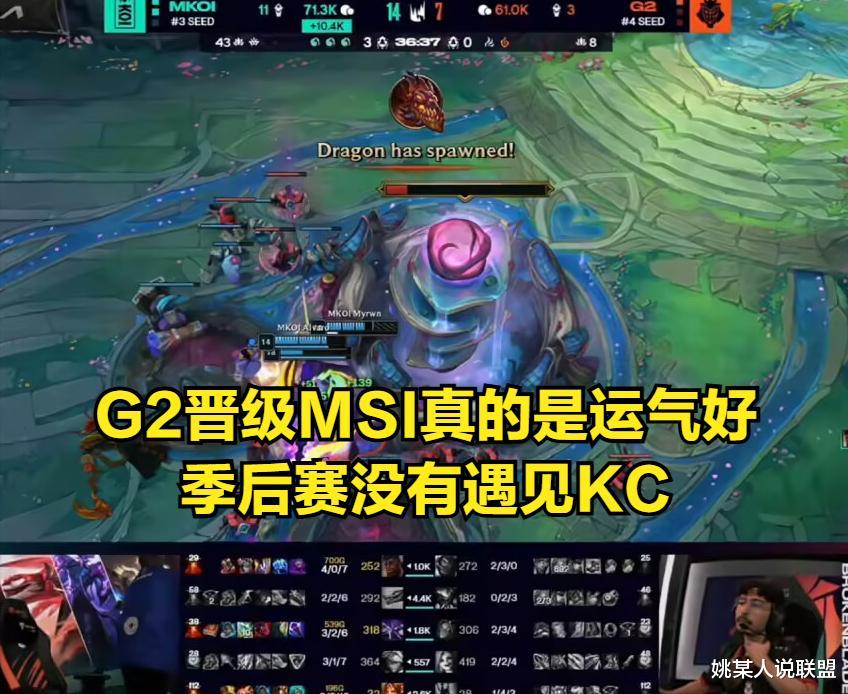 因为G2在季后赛当中,根本没有遇见常规赛排名第一的KC战队。反观KC在跟MKOI鏖战五局,最终惜败给MKOI,所以不少观众认为,但凡KC在季后赛首选G2战队,那么G2可能会被KC暴打,最终无缘MSI。G2官博赛后也是发文自我调侃,表示G2中单选手CAPA已经老了,没办法统治LEC。