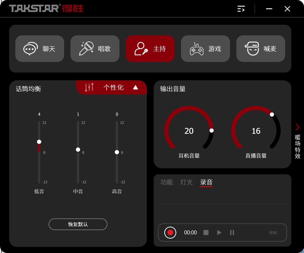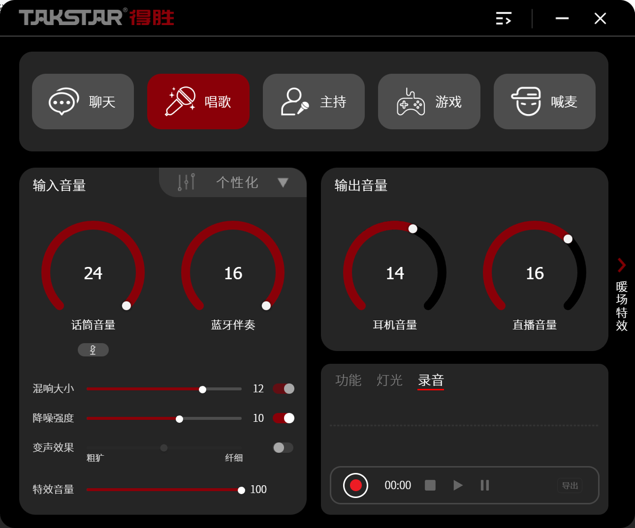 在“唱歌模式”下,我将麦克风音量调至23,伴奏调至16;切换到“游戏模式”时,系统自动恢复到我之前设定的游戏语音配置,麦克风23,伴奏16。这种“千人千面”的记忆逻辑,彻底解决了多场景切换时的繁琐调试,让设备真正适应了用户的习惯。