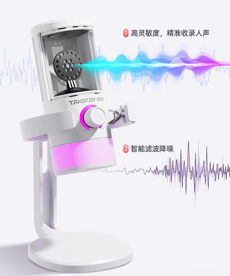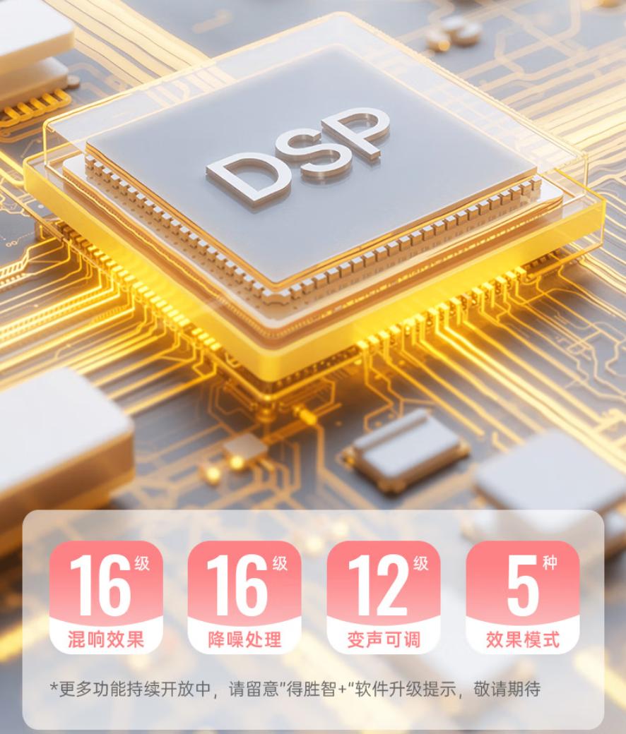 1. 内置DSP声卡芯片:将专业声卡与麦克风合二为一,无需额外购买声卡,即插即用,大幅降低入门门槛。