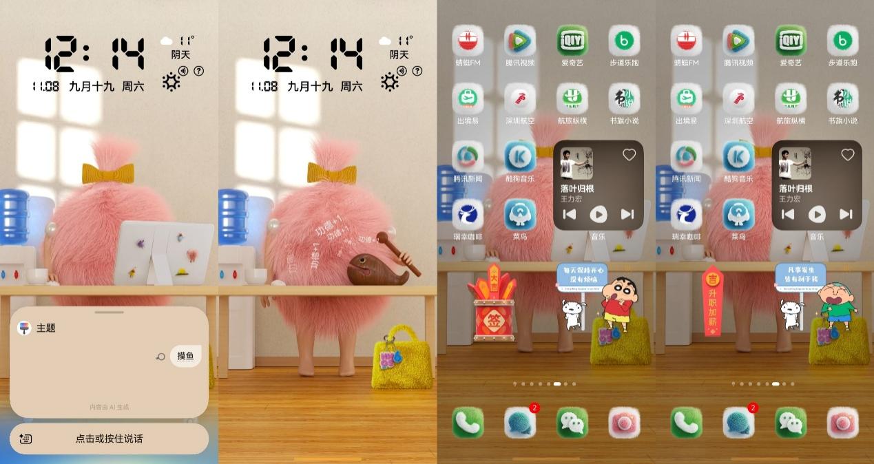 我换了一个非常好玩的《精致毛球的一天》主题。这个毛茸茸的小家伙非常可爱,还是我这个打工人的神同步,陪我洗漱、挤地铁、上班、沙发瘫……上班累了的时候,我还能逗它玩,在锁屏界面语音互动,让它陪我“摸鱼”。这种陪伴感,真的特别治愈。