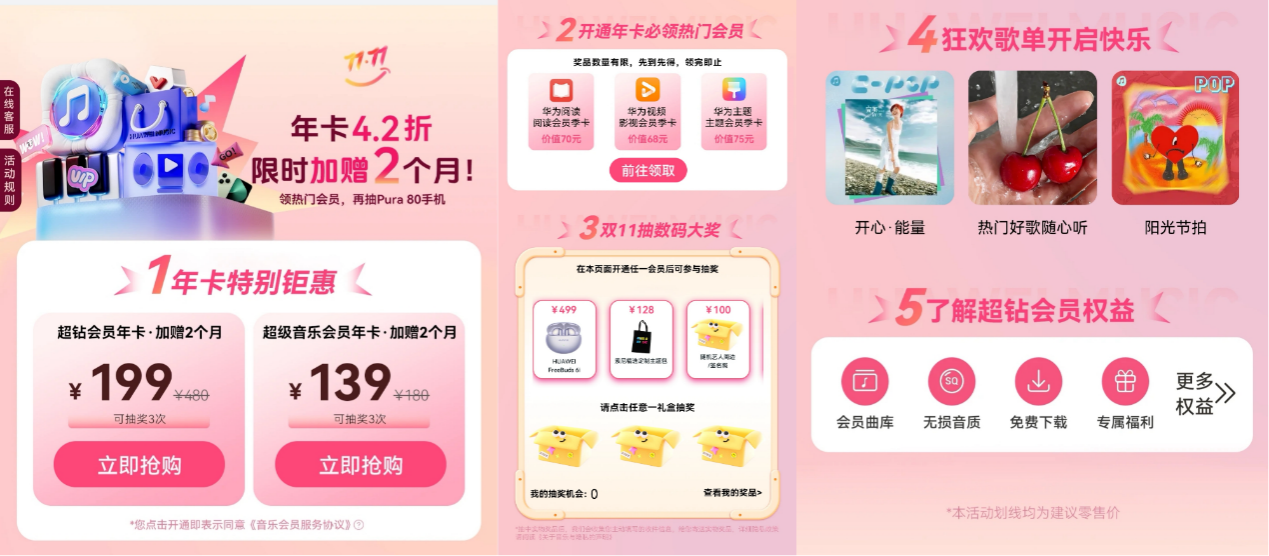 我这次双十一同时入手了主题会员和音乐的超钻会员,感觉已经很超值了。它们不仅有年卡优惠,还都有赠送会员、抽奖等福利。但如果你还需要华为视频、云空间、阅读等会员,那么直接开Petal One会员会更划算。它把这些华为应用的会员都打包了,算下来要比单独开更划算。