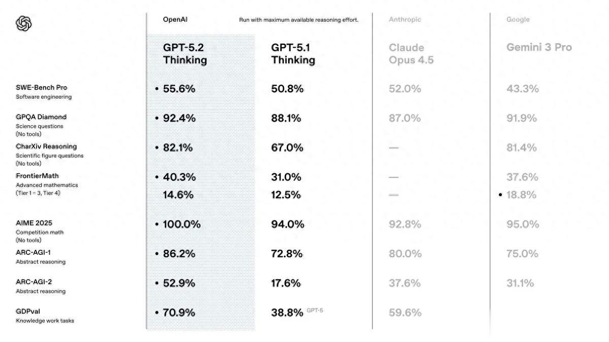 竞争的火药味从未如此浓烈。Gemini 3在上月发布后迅速集成到Google生态,覆盖搜索、Workspace和云服务,吸引了无数企业用户。Anthropic的Claude Opus 4.5也在编码领域紧咬不放。OpenAI内部员工甚至有人建议推迟发布,以进一步完善模型,但Altman选择加速——结果证明,这是一记精准的反击。