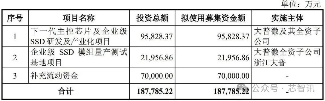 招股书显示,大普微原计划募资18.78亿元。其中,9.58亿元将用于下一代主控芯片及企业级SSD研发及产业化项目,2.20亿元用于企业级SSD模组量产测试基地项目,另外7亿元补充流动资金