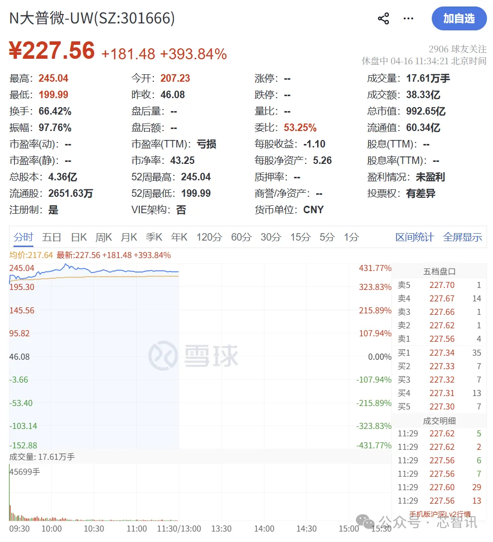截至午间收盘,大普微股价报225元左右,成交额超34亿元,换手率接近60%,市场热度可见一斑。