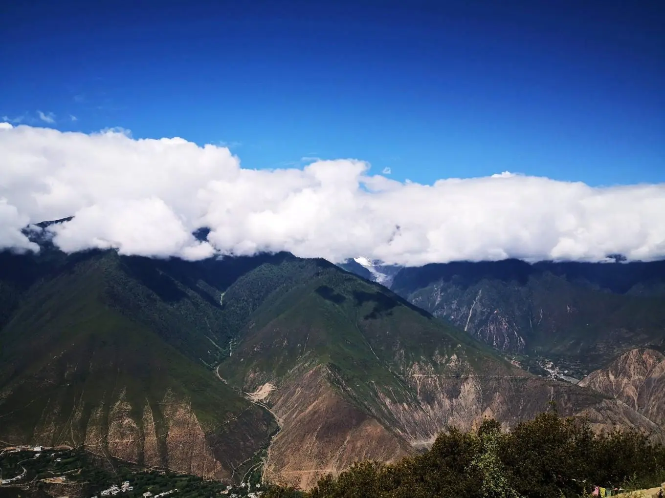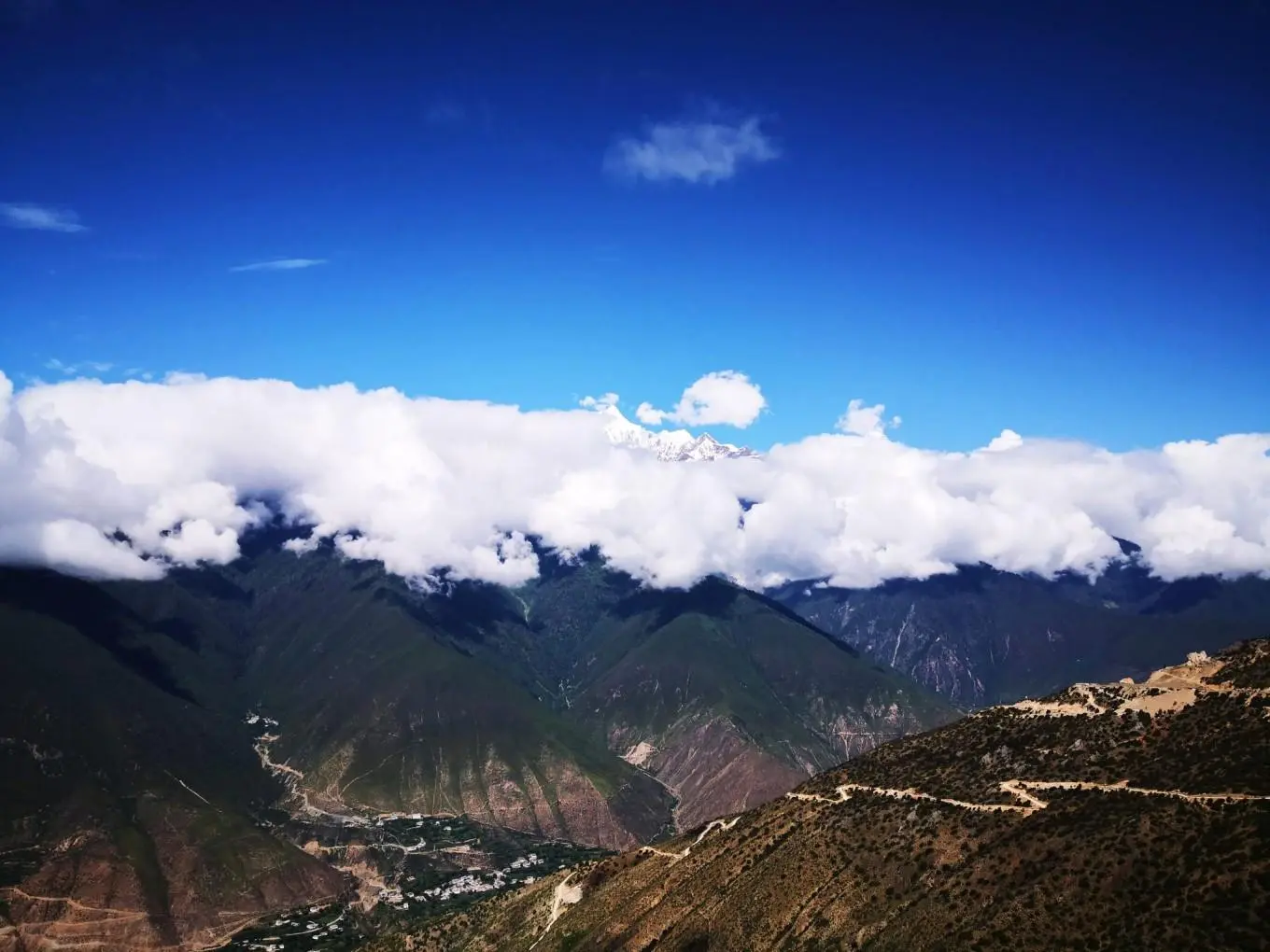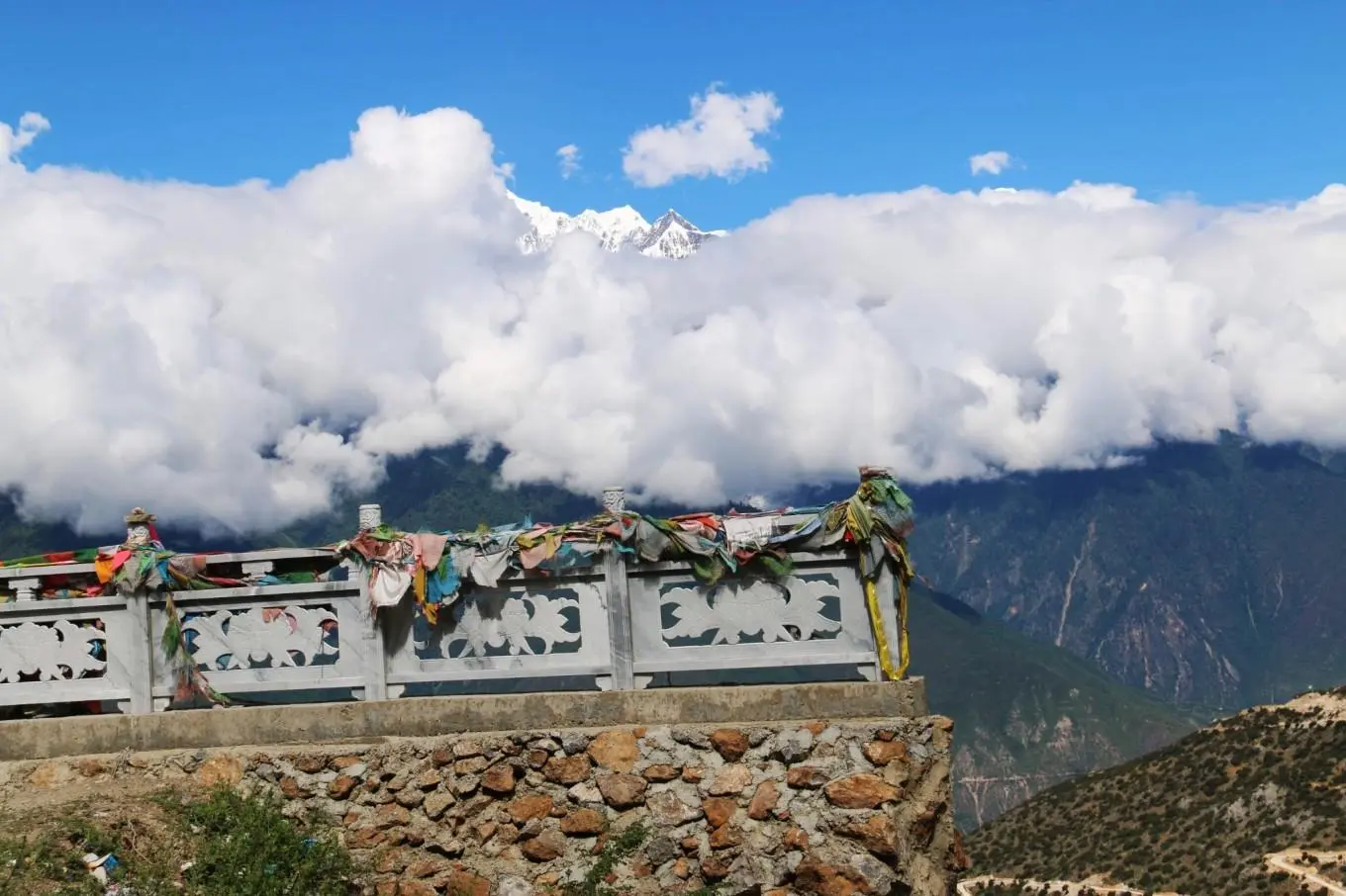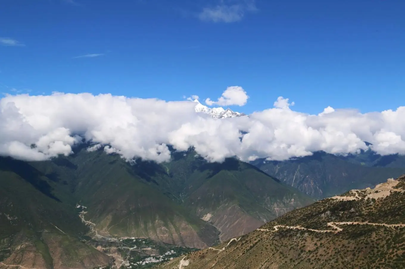 天不可不谓蓝,云不可不谓白,山也不可不谓绿,可是一切组合起来仿佛就要和游客较劲一般,除了梅里雪山13座白雪覆盖的山峰总是藏于白云之中,其他一切都坦荡荡示人于眼前。总之一句话,你最想见到的死活不让你见到。
