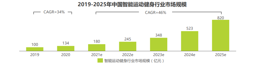 而随着华为、小米、百度等科技巨头的投身智能健身市场,整个智能健身赛道的发展也在不断加快。据《2021中国运动健身行业报告》显示,今年我国家庭智能健身设备消费支出同比增速达到32.9%,创下近三年来新高。而另据《中国智能运动健身行业研究报告》预计,到2025年,智能运动健身行业市场规模预计达到约820亿元,年均复合增长率高达46%。