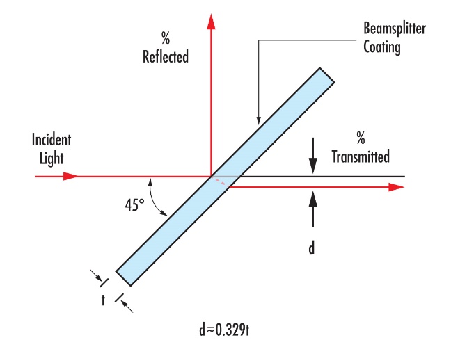 工程师避坑指南:光线穿过玻璃板时,不可避免地会在后表面产生多余的“菲涅尔反射”(即重影)。因此,大多数高质量的平板分光镜都会在内表面镀上增透膜(AR膜)来消除这一影响。此外,当光线以45°角穿过具有一定厚度的玻璃板时,透射光会产生光束位移(Beam Displacement),在光路设计时必须将此计算在内。