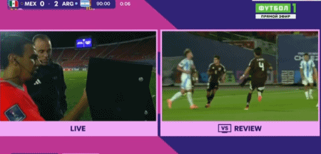 比赛第23分钟,莫拉禁区内倒地,墨西哥挑战VAR,回看后裁判宣布挑战失败。