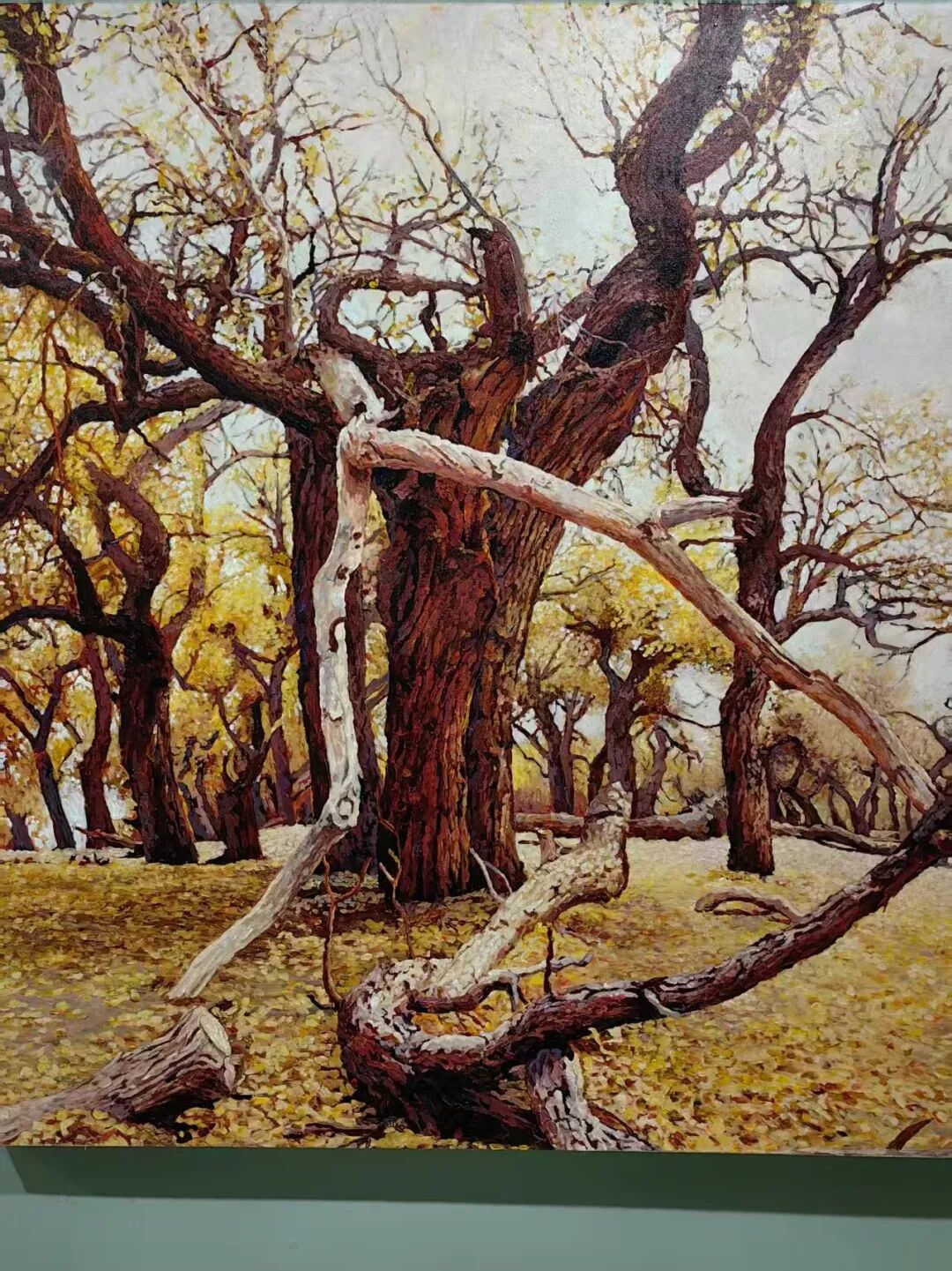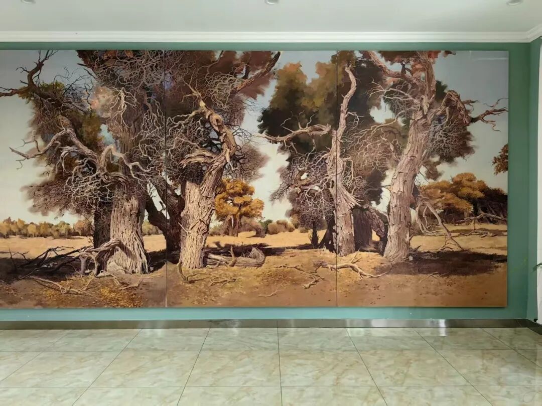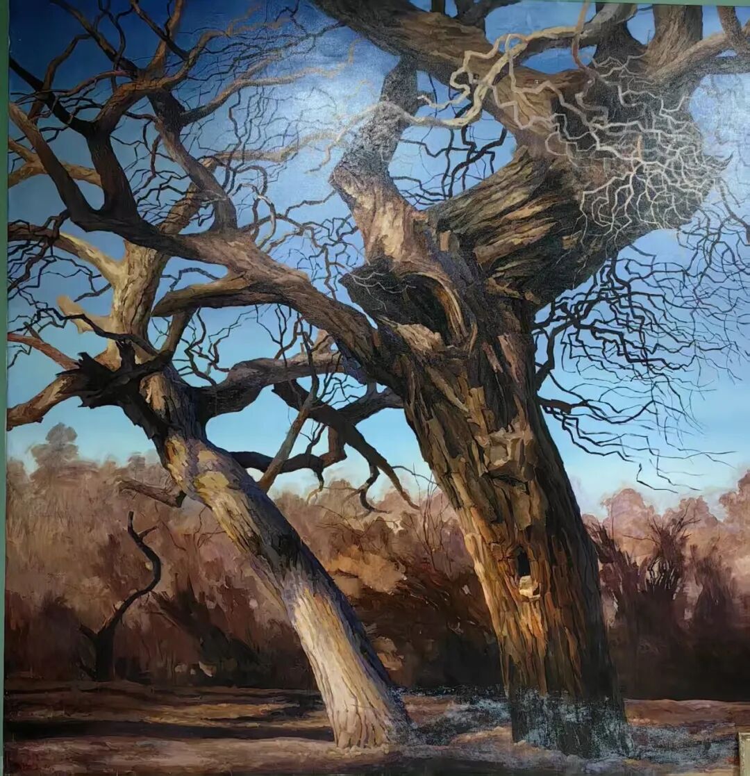 四、立象寄志 铸魂传神先生的作品多为气势恢宏的巨幅创作,笔墨沉厚、构图开阔。他笔下的胡杨,枝干虬劲苍健,树皮斑驳沧桑,尽显风沙磨砺后的刚毅;树冠昂扬向上、直指云天,宛如戍边战士昂首挺立。在《大将军》《永远的胡杨》《戈壁战士》等代表作中,胡杨身披落日金辉,傲立于苍茫戈壁,于苍凉中见气魄,于坚守中显风骨,生动写照出兵团儿女扎根边疆、忠诚报国、无私奉献、坚韧不拔的崇高品格。作品不事雕琢、质朴有力,既展现大漠的雄浑气象,又传递直抵人心的精神力量,让人驻足凝望间,便能读懂坚守与信仰的分量。五、师法自然 意蕴深厚在艺术表现上,牛连和先生走出了一条兼具民族气质与时代风貌的创作道路。他以西画写实的造型与光影为基础,精准刻画出胡杨的体量感与沧桑肌理,树干转折有力,层次细腻真实;同时融入中国传统绘画的写意神韵,追求形神兼备、意境悠远,使画面既有强烈的视觉冲击力,又含东方美学的含蓄韵味。画面以戈壁土黄、赭石为底色,铺展瀚海辽阔的苍茫意境,再以灿烂金黄点染胡杨,冷暖相映,更显生命的热烈与不屈。这种融合并非简单技法拼接,而是精神层面的自然贯通,让作品成为弘扬爱国情怀、增进民族团结的生动载体,具有深刻的时代意义。