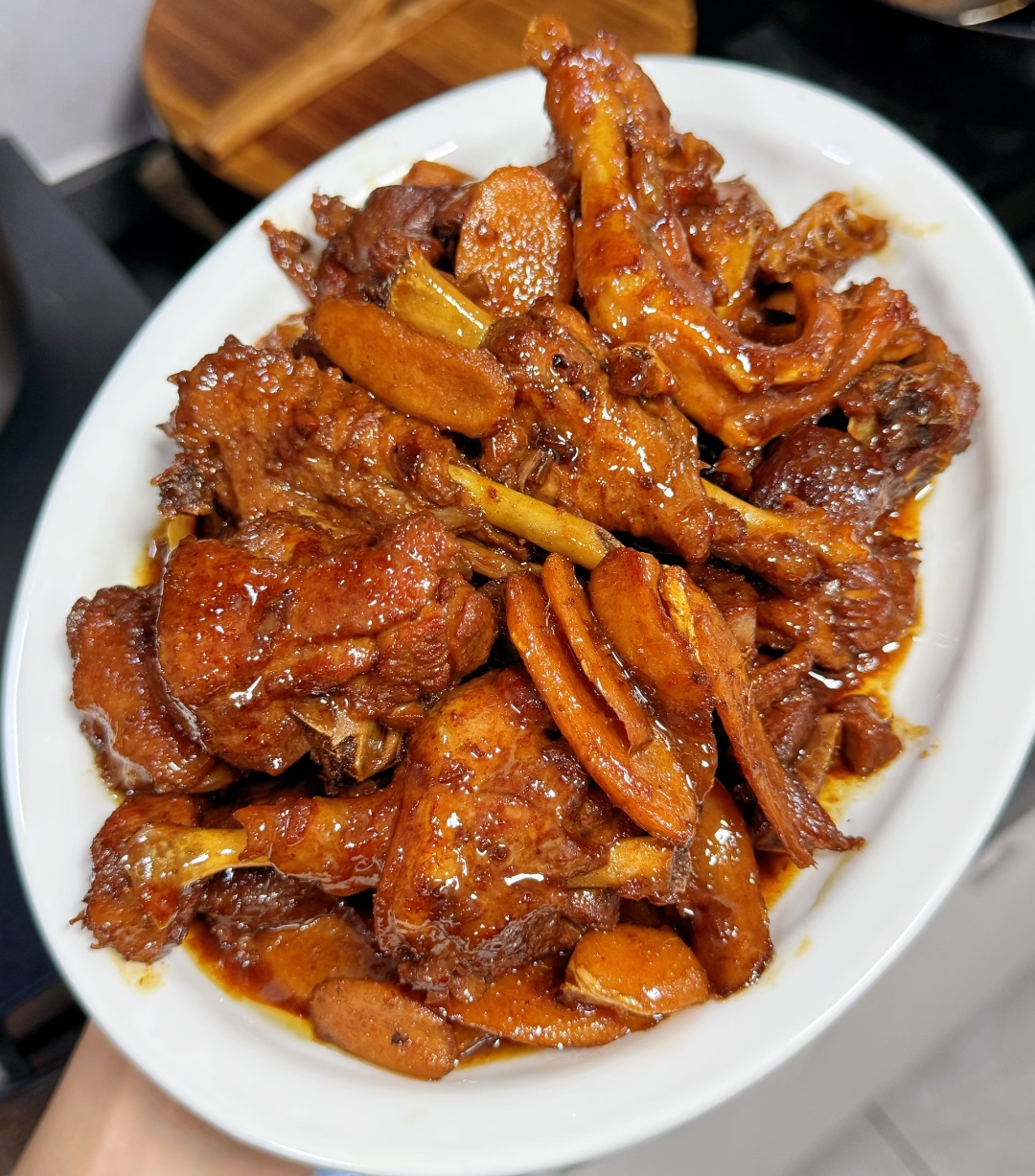 盖上锅盖,转小火慢煮。这是一场时间的转化,让酒精挥发,留下米酒的香甜渗入鸭肉纤维。期间可不能撒手不管,得时不时揭开盖子翻个面,防止糊锅,让每一块鸭肉受热均匀。等到汤汁收得只剩少许,那浓稠的汤汁挂在肉上,就可以准备出锅了。出锅前记得尝尝咸淡,因为酱油和蚝油都有咸味,通常不用加盐,若是口味重,适当加一点也无妨。