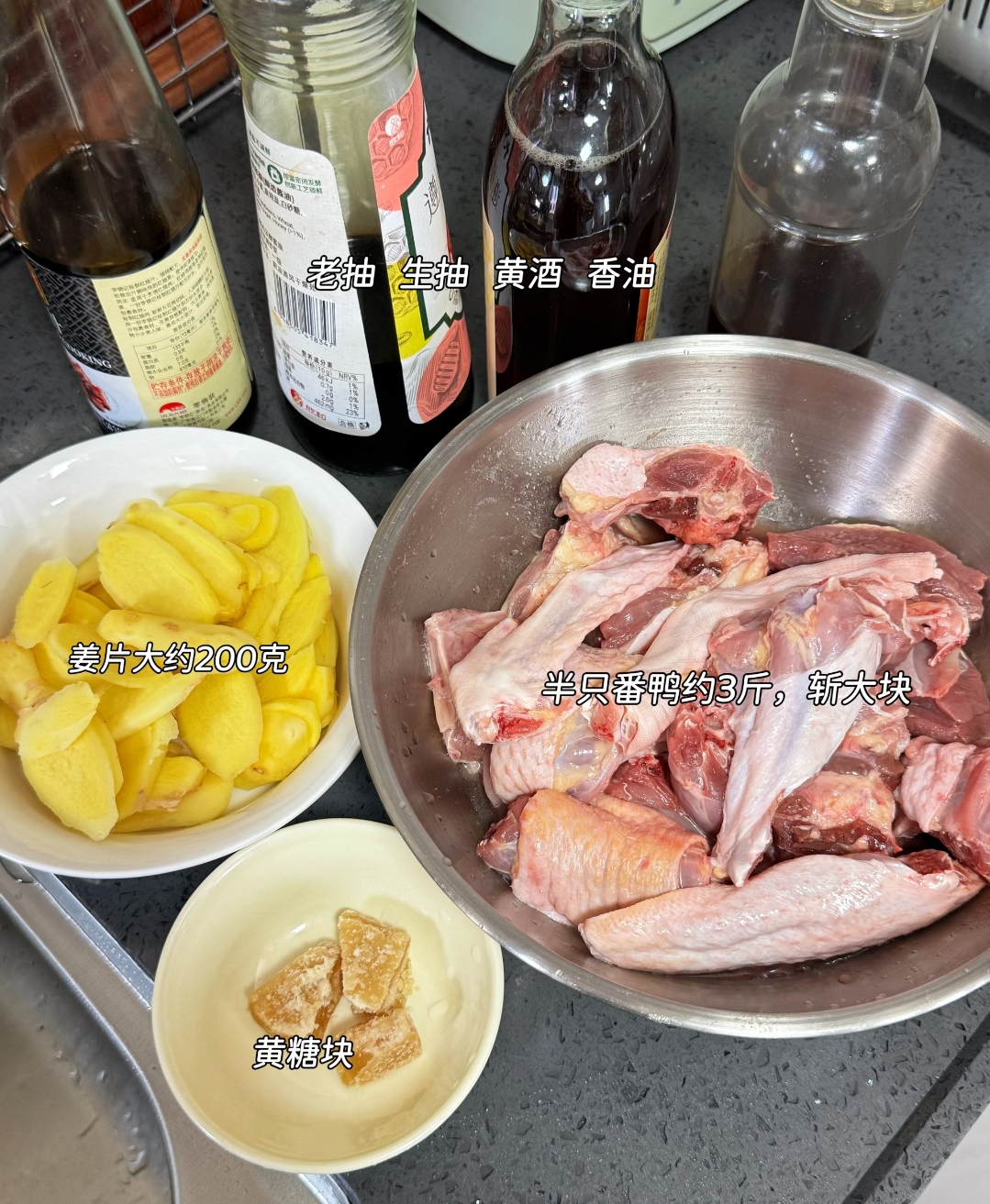 这时候该调味上色了。往锅里放入两勺生抽提鲜,一勺老抽上色,再来一勺蚝油增香,最后撒上一小把冰糖,大概十五颗左右。有了冰糖,成菜才会透着股红亮的色泽和微微的回甘。把这些佐料翻炒均匀,看着每一块鸭肉都裹上酱色,就可以把刚才炸得干焦的姜片回锅了。接着倒入米酒,米酒的量要控制好,没过鸭肉表面能看见酒就行,千万别加水,纯酒慢煮才能保证肉质的醇香。要是家里没米酒,用啤酒代替也是个不错的法子。
