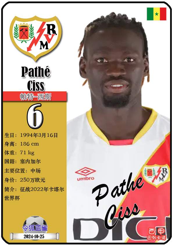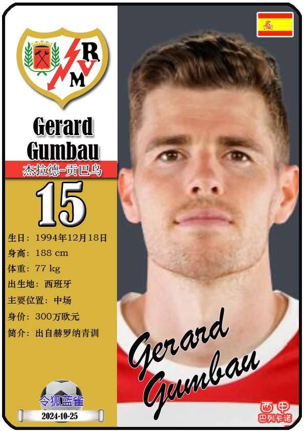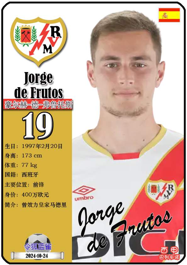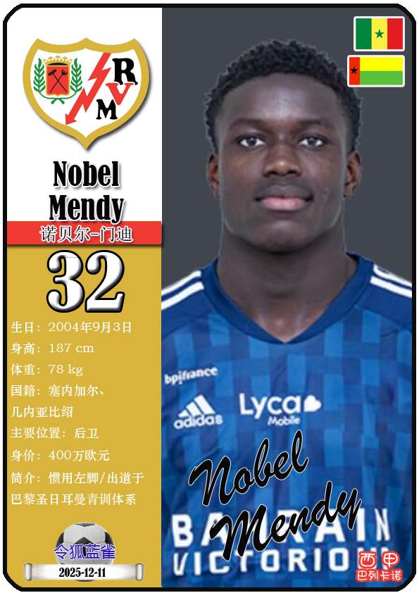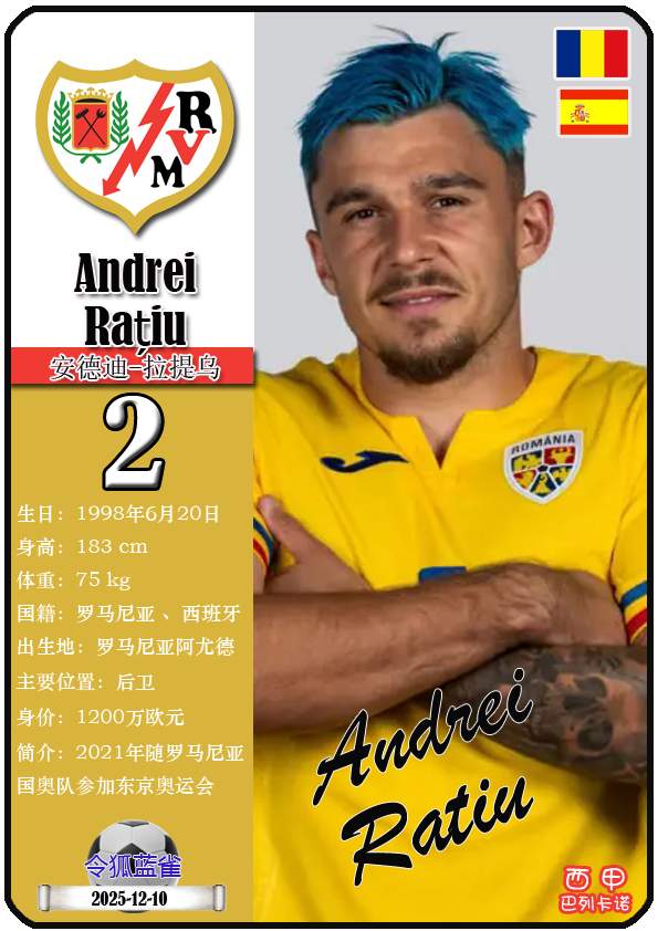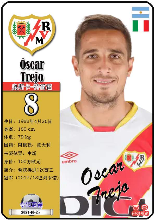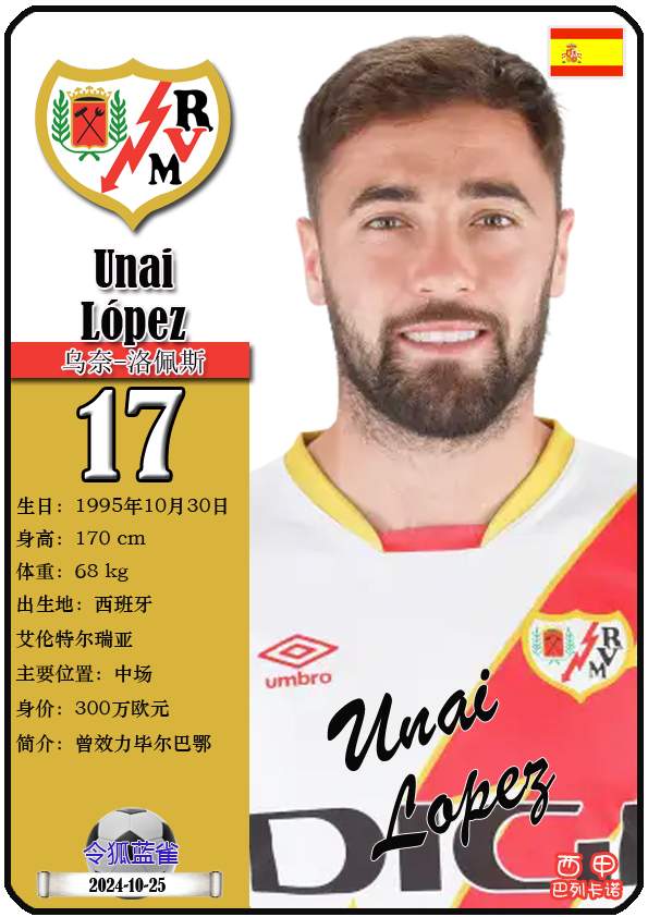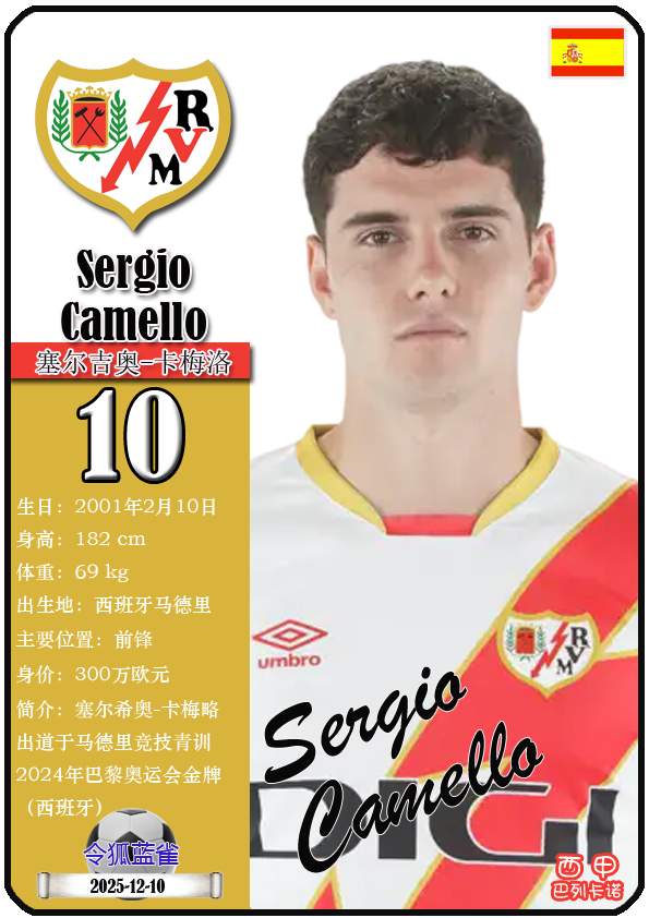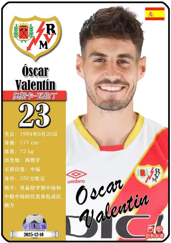 西甲巴列卡诺足球俱乐部的前身“埃尔-拉约体育协会”成立于1924年5月29日,距今已有101年历史。截至2025年12月11日,球队主教练是伊尼戈·佩雷斯,队内拥有球员塞尔吉奥-卡梅洛、亚历山大-茹拉夫斯基、奥斯卡-特雷霍等。本期以球星卡的形式展示目前西甲巴列卡诺足球俱乐部的21名球员(按球衣号码排序):