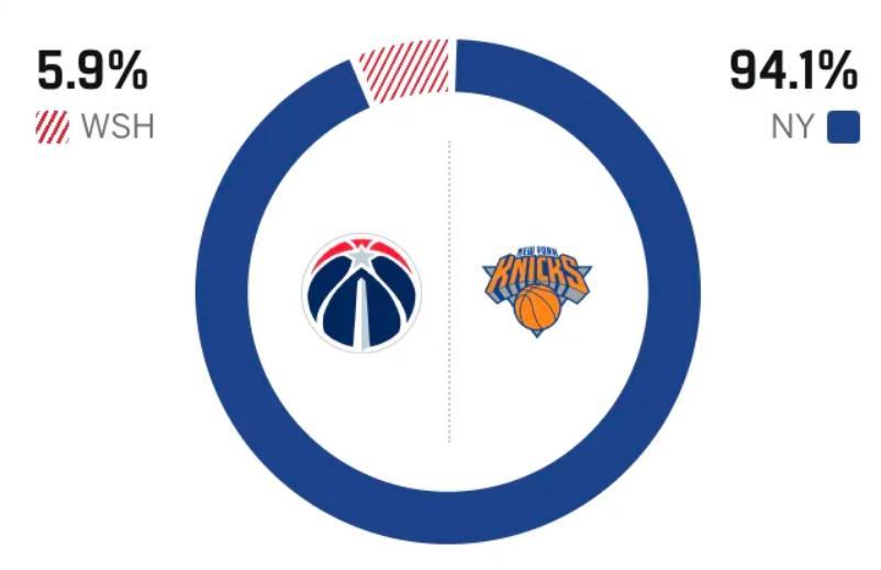 赛前,美媒ESPN对本场比赛进行了胜率预测,奇才队胜率仅有可怜的5.9% ,尼克斯胜率则高达94.1% , 这差距真是悬殊。