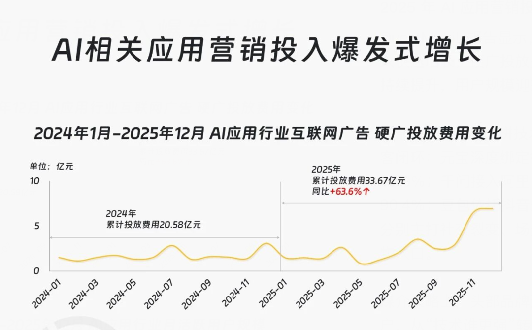 然而需要注意的是,近年来AI广告投放激增,一定程度上源于技术爆发初期的“非理性投入”。QuestMobile披露的数据显示,2025年,中国AI应用互联网硬广投放费用达33.67亿元,同比飙升63.6%。