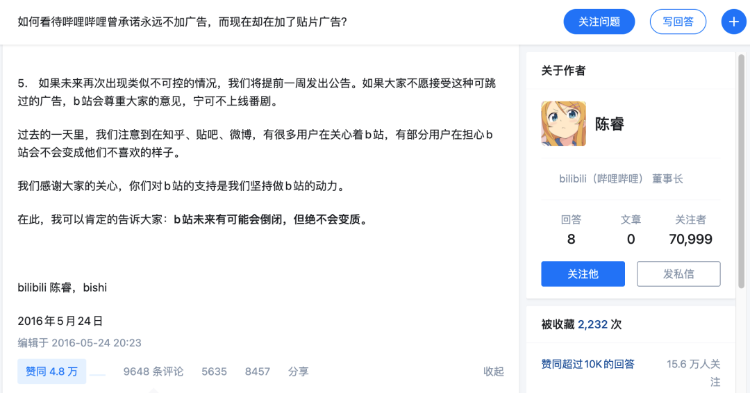 早在2014年,B站就曾对用户做出“正版新番永远不加贴片广告”的承诺。2016年5月,因著作权方强制要求上线贴片广告,引发舆论海啸,B站董事长、CEO陈睿亲自向用户道歉,并表示“B站未来有可能会倒闭,但绝不会变质。”