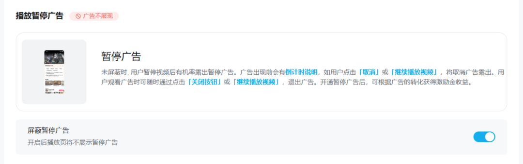 2026年4月10日,B站上线播放暂停广告功能。UP主开启该功能后,用户暂停视频后有概率显示广告。用户观看广告时可随时通过点击“关闭按钮”或“继续播放视频”退出广告。开通暂停广告后,UP主可根据广告转化获得激励金收益。