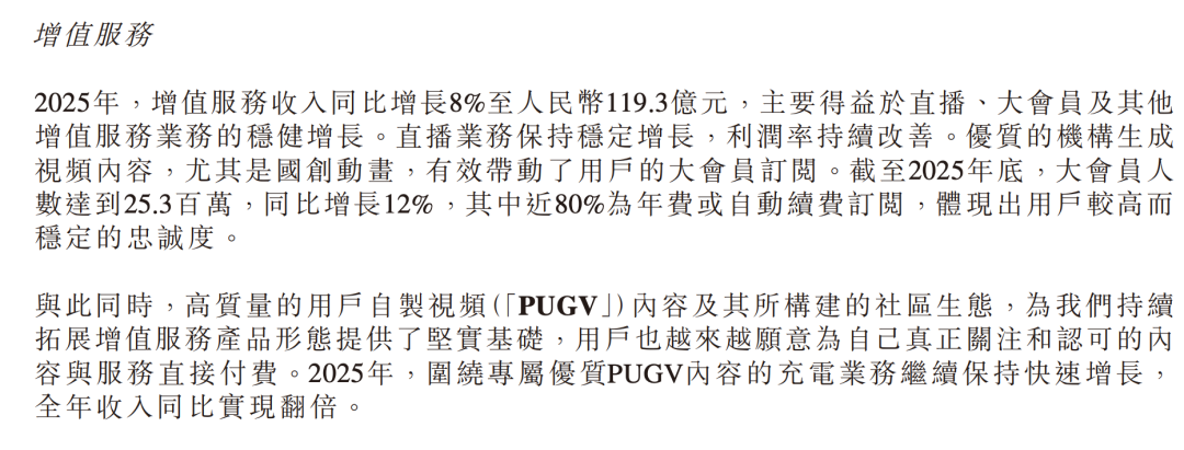 不过发展社区内容也意味着B站难以靠用户付费打开成长空间。财报显示,2025年,B站增值服务营收119.3亿元,同比仅增长8%,相较上年增速回落3个百分点。