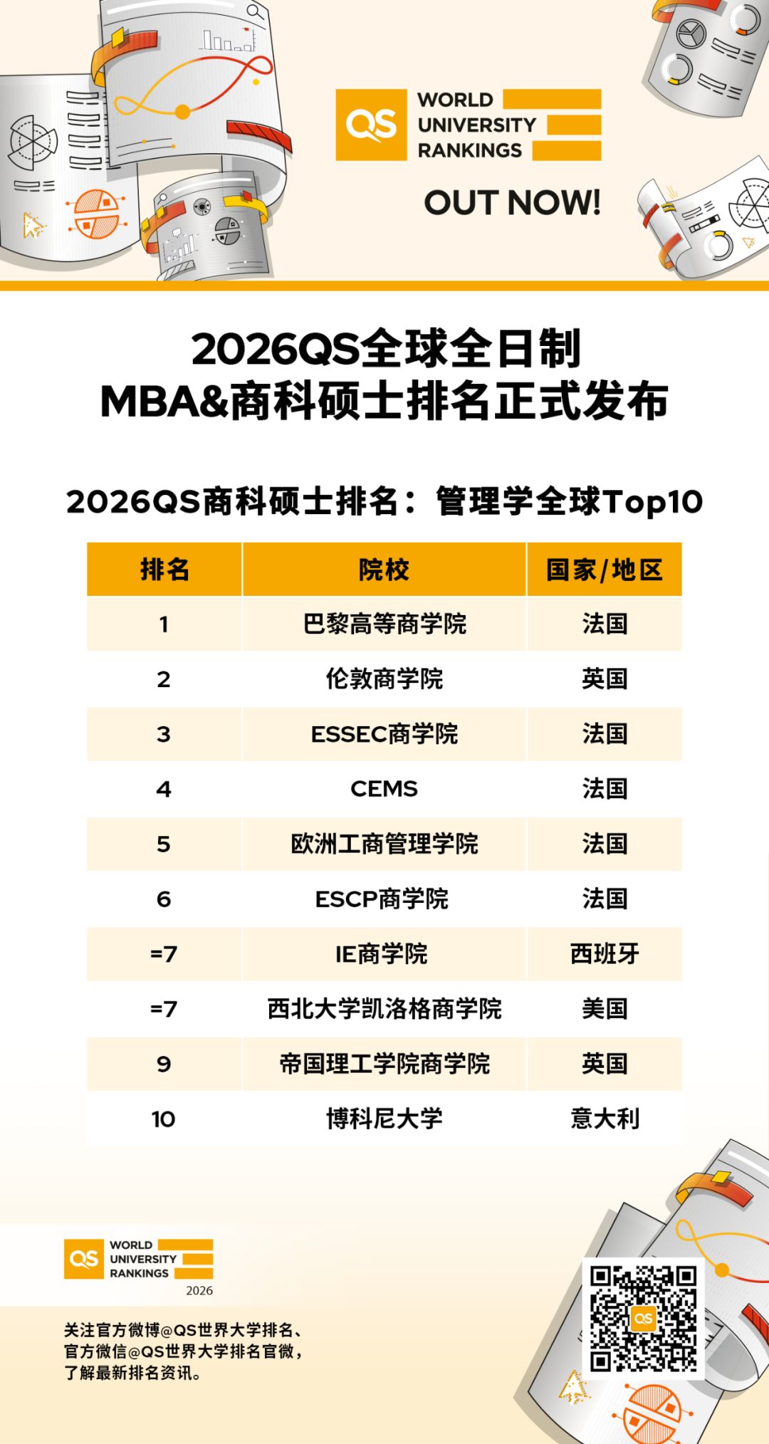 2025年9月17日,国际高等教育研究机构 Quacquarelli Symonds(以下简称 QS )发布了2026QS全球全日制MBA &商科硕士排名!