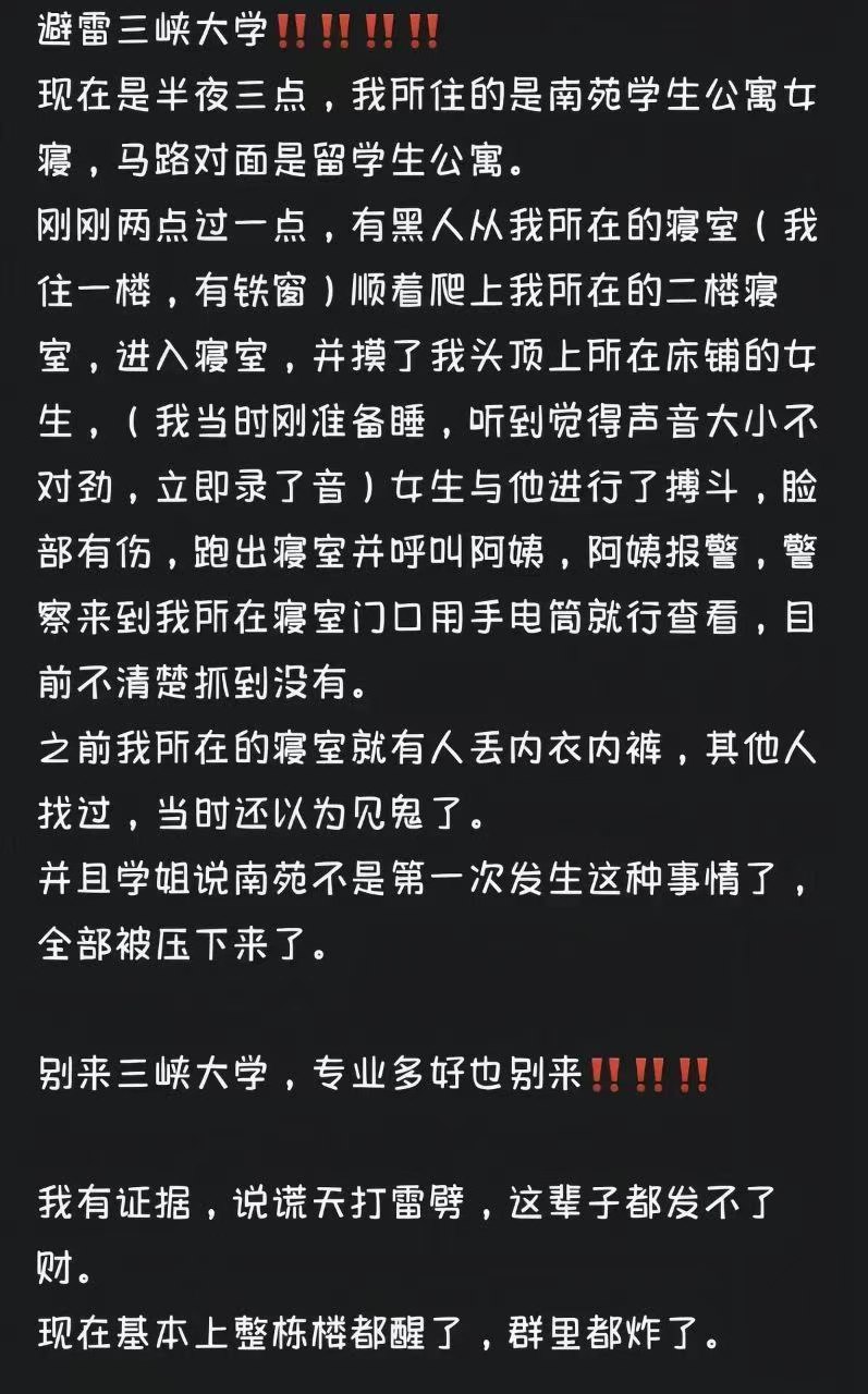 10月25日凌晨,湖北省宜昌市三峡大学。一名黑人留学生徒手攀爬至女生宿舍二楼,企图猥亵一名女学生。受害女生奋力反抗并大声呼救,迫使黑人留学生仓皇逃离。随后,宿管阿姨报警,警方介入展开调查。然而,学校为压制舆情,直接解散相关宿舍微信群并禁止内部讨论。事件爆发已逾四天,三峡大学至今仍未就此猥亵案作出任何正式回应