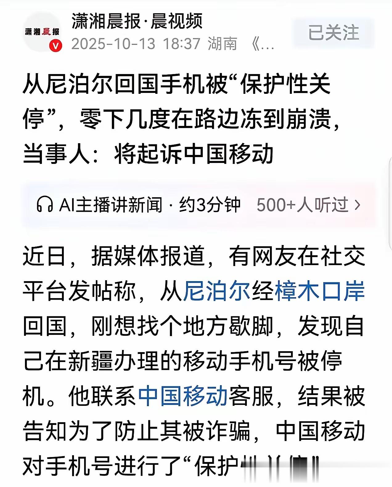 起初他以为是欠费,立刻充值200元,可信号依旧全无。联系中国移动客服后,得到的答复令人错愕:为防范电信诈骗,号码已被“保护性关停”,需到营业厅办理复通 。此时的聂拉木县正大雪纷飞,积雪深及膝盖,气温骤降至零下,全城因雪灾停电,当地营业厅早已关门,身无现金的他既无法扫码支付食宿,也不能联系外界,只能在寒风中冻得瑟瑟发抖,陷入“叫天不应”的绝望 。