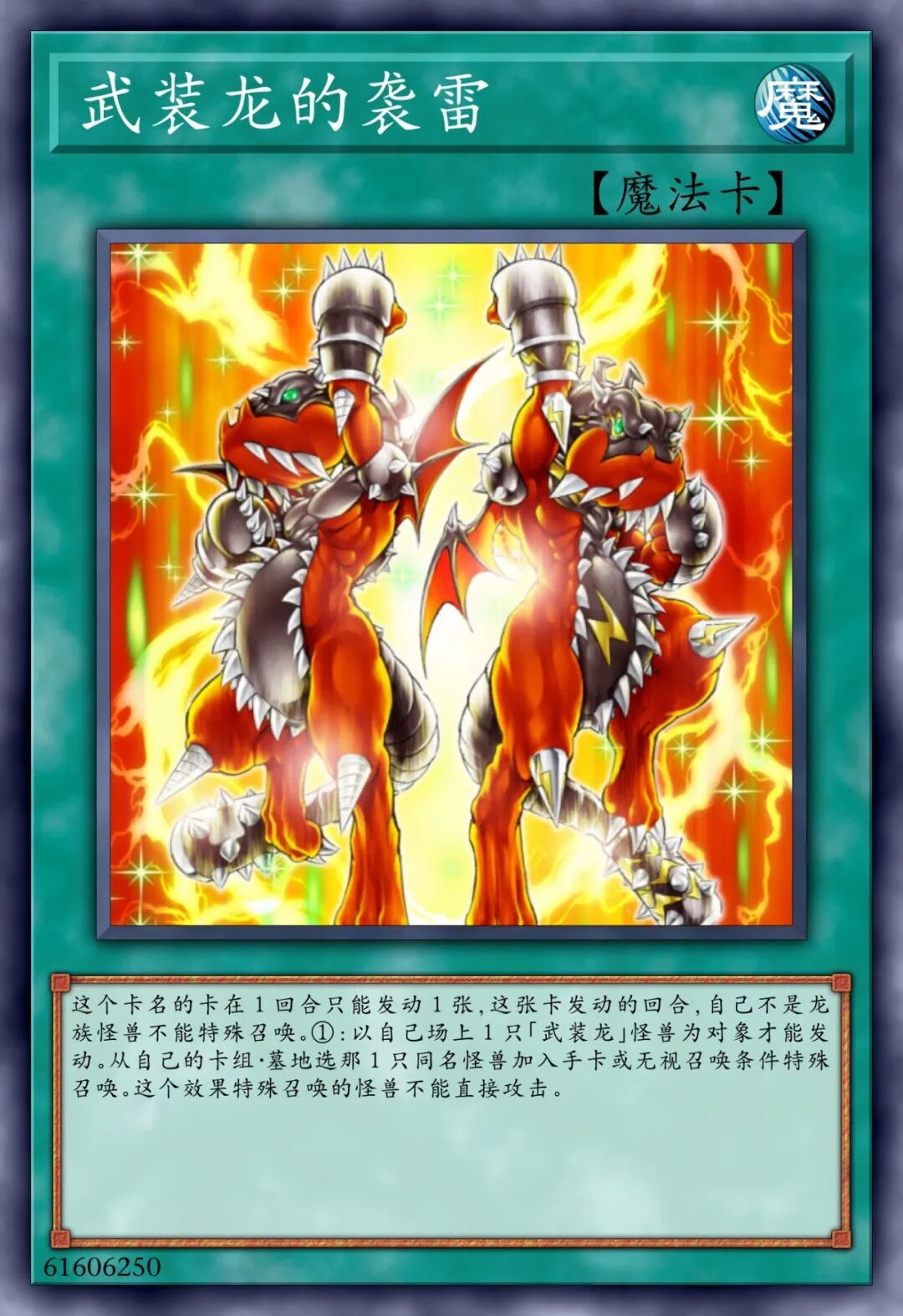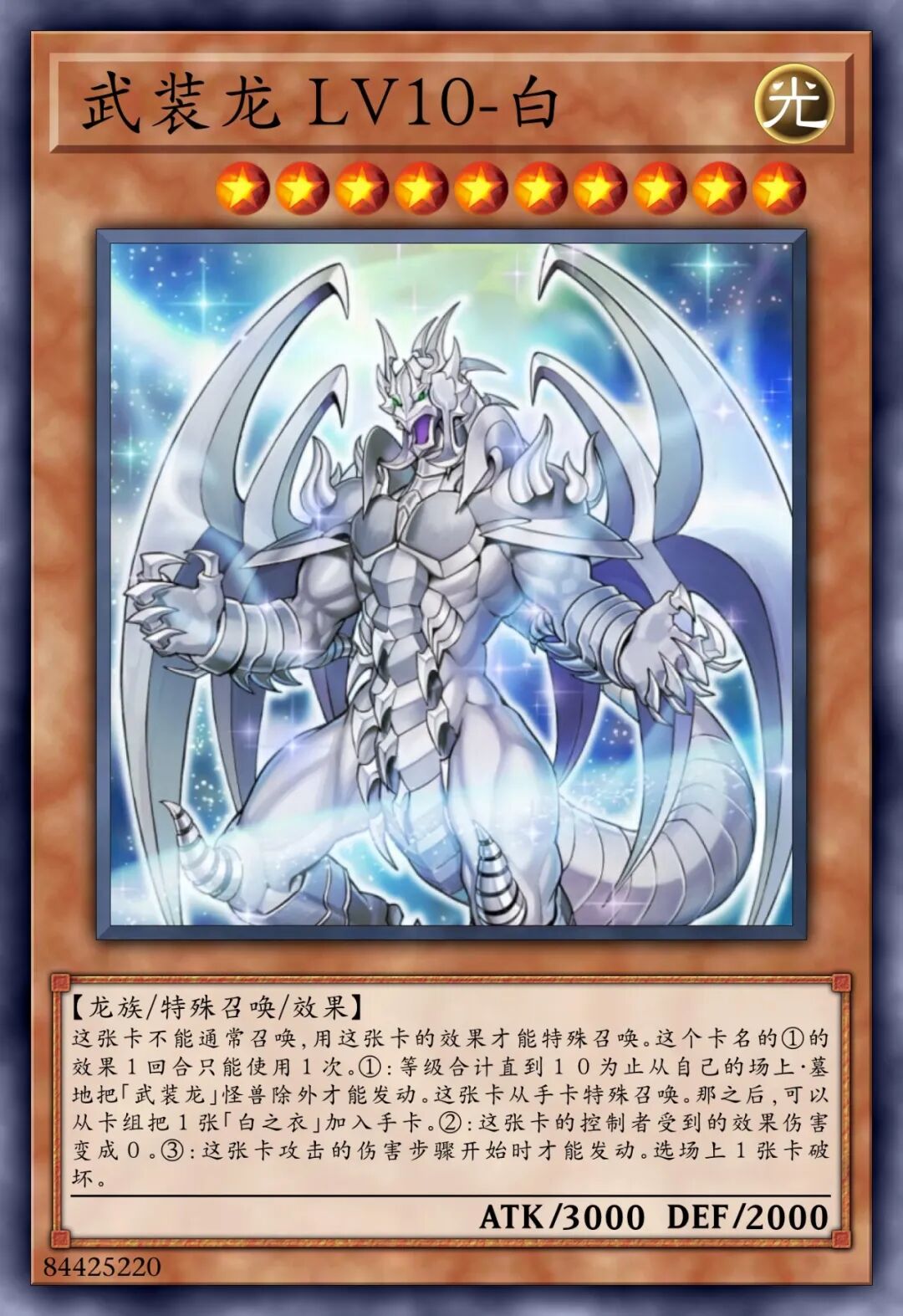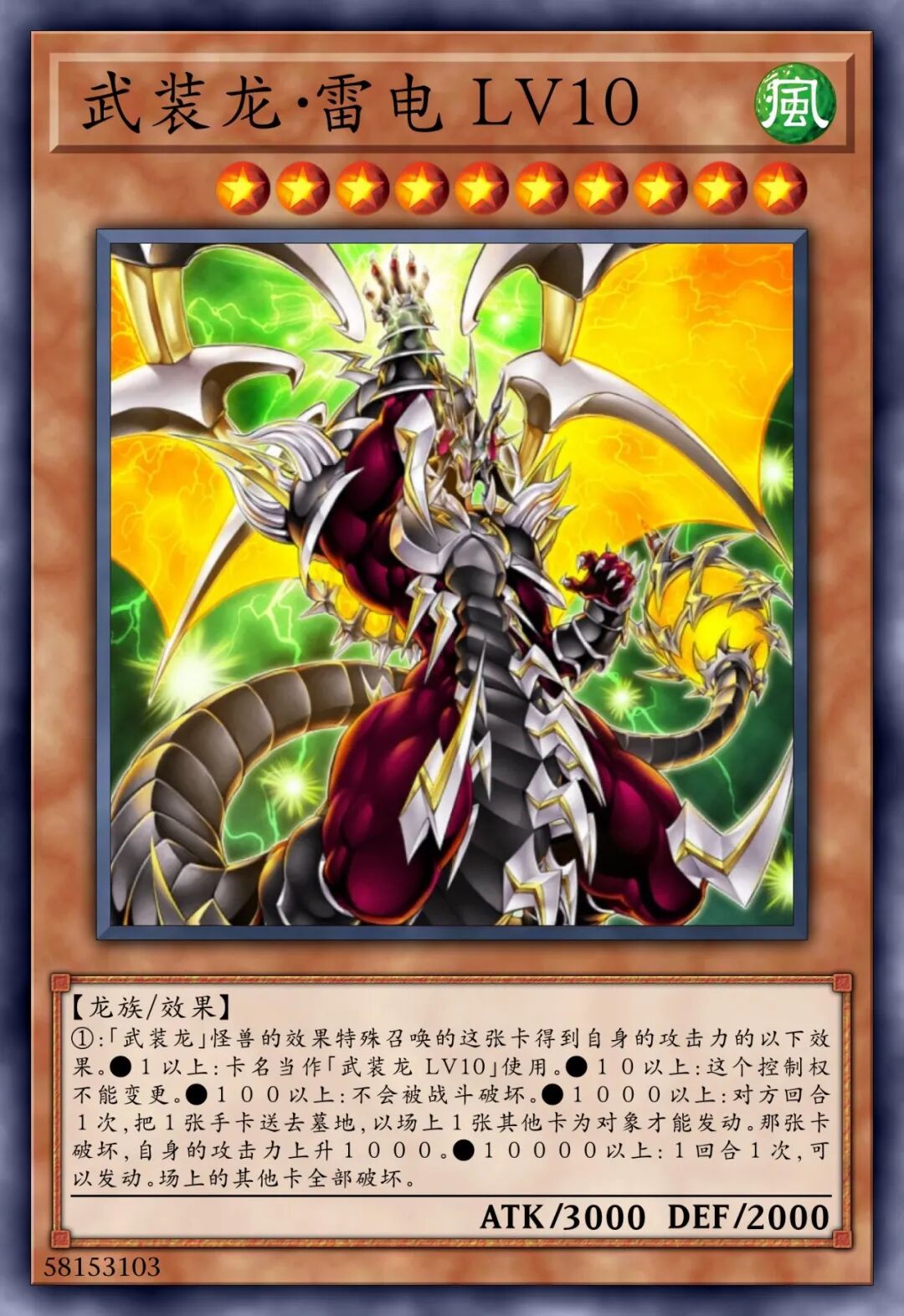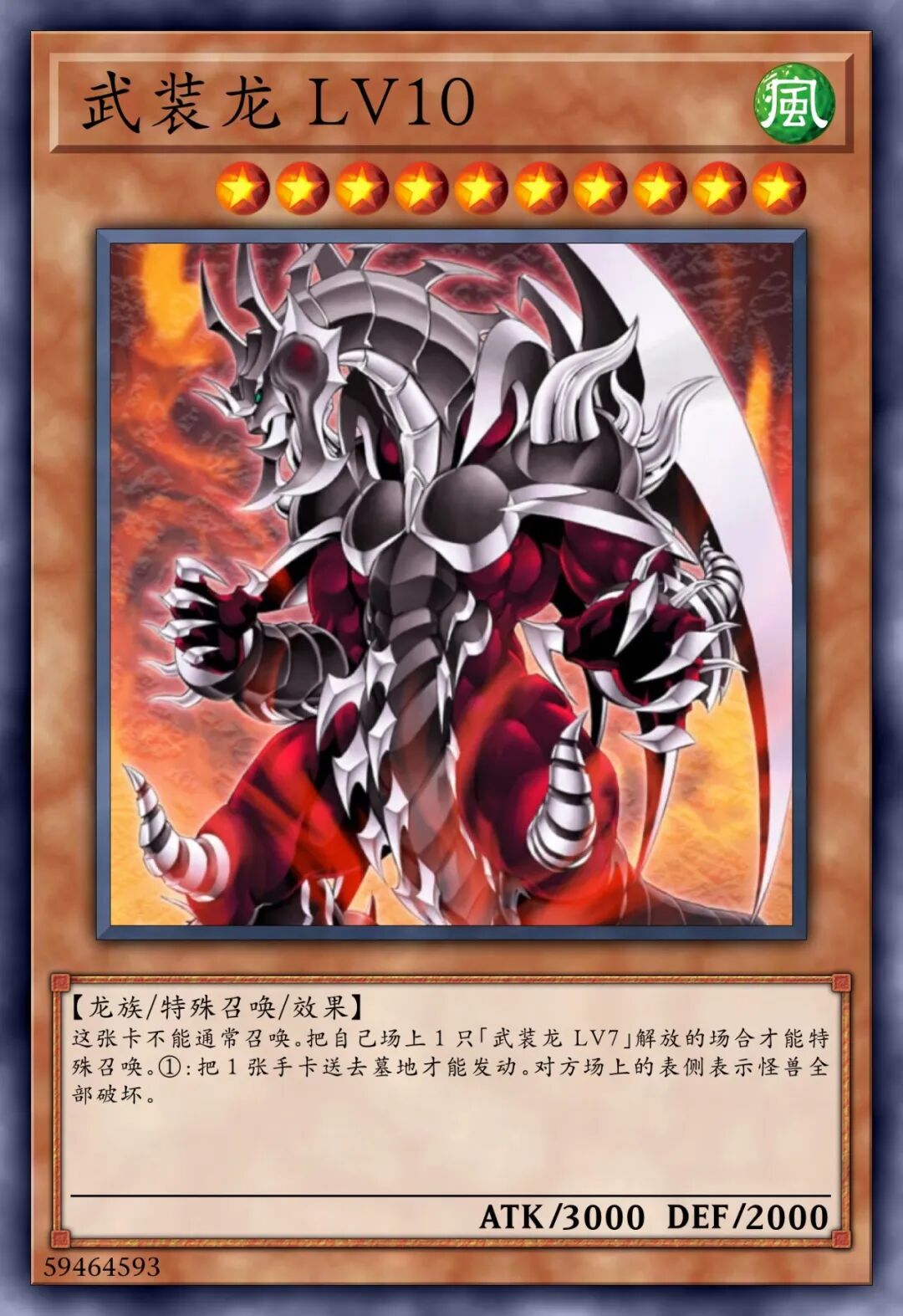 【龙族/效果】①:「武装龙」怪兽的效果特殊召唤的这张卡得到自身的攻击力的以下效果。•1以上:卡名当作「武装龙 LV10」使用。•10以上:这张卡的控制权不可以变更。•100以上:这张卡不会被战斗破坏。•1000以上:对手回合1次,将1张手牌送去墓地,以场上1张其他卡为对象才可以发动。那张卡破坏,自身的攻击力上升1000点。•10000以上:1回合1次,可以发动。将场上的其他卡全部破坏。