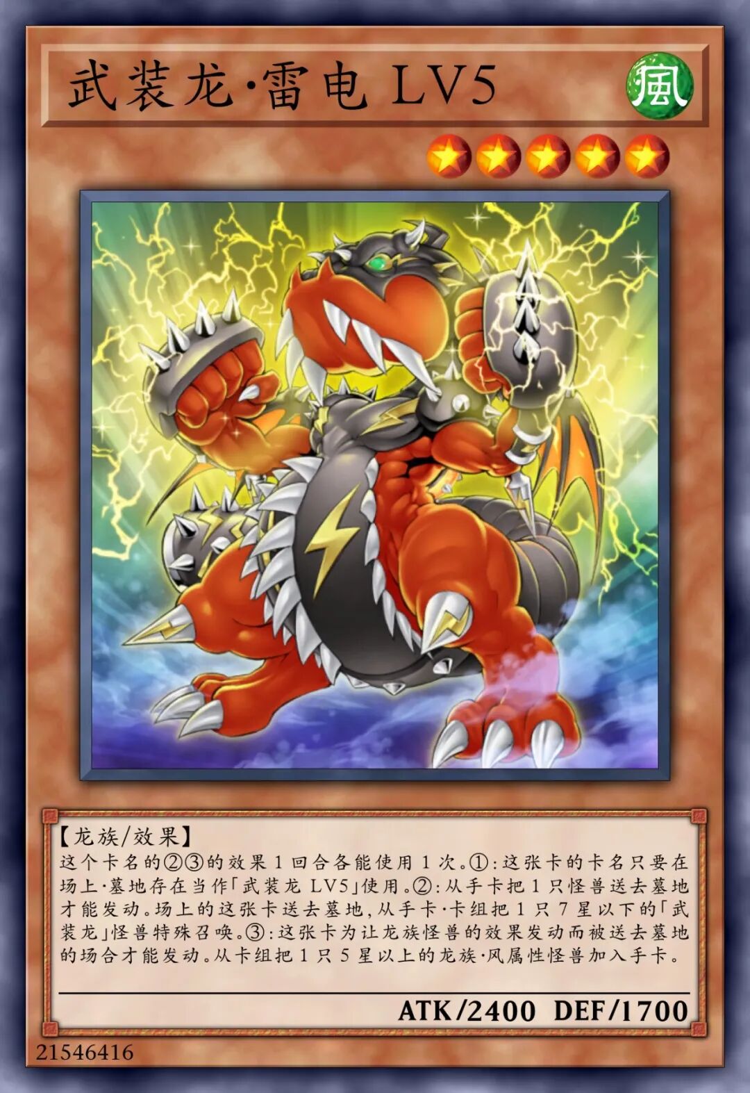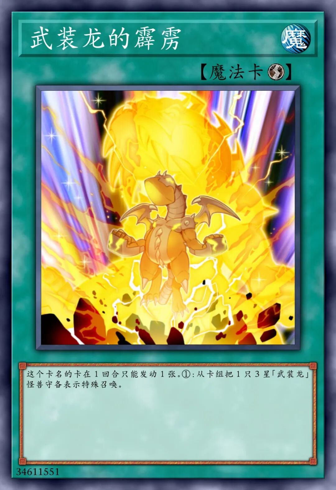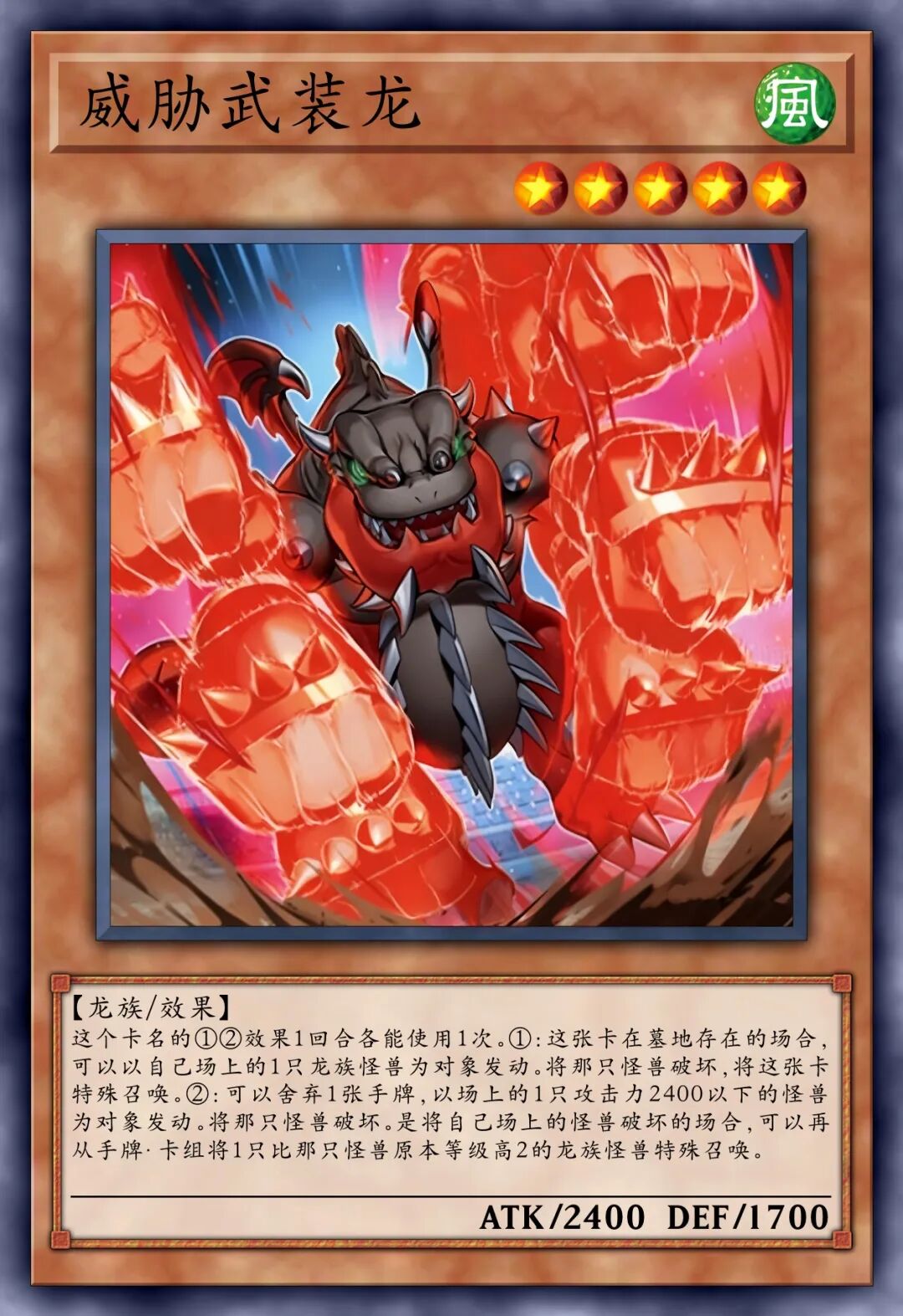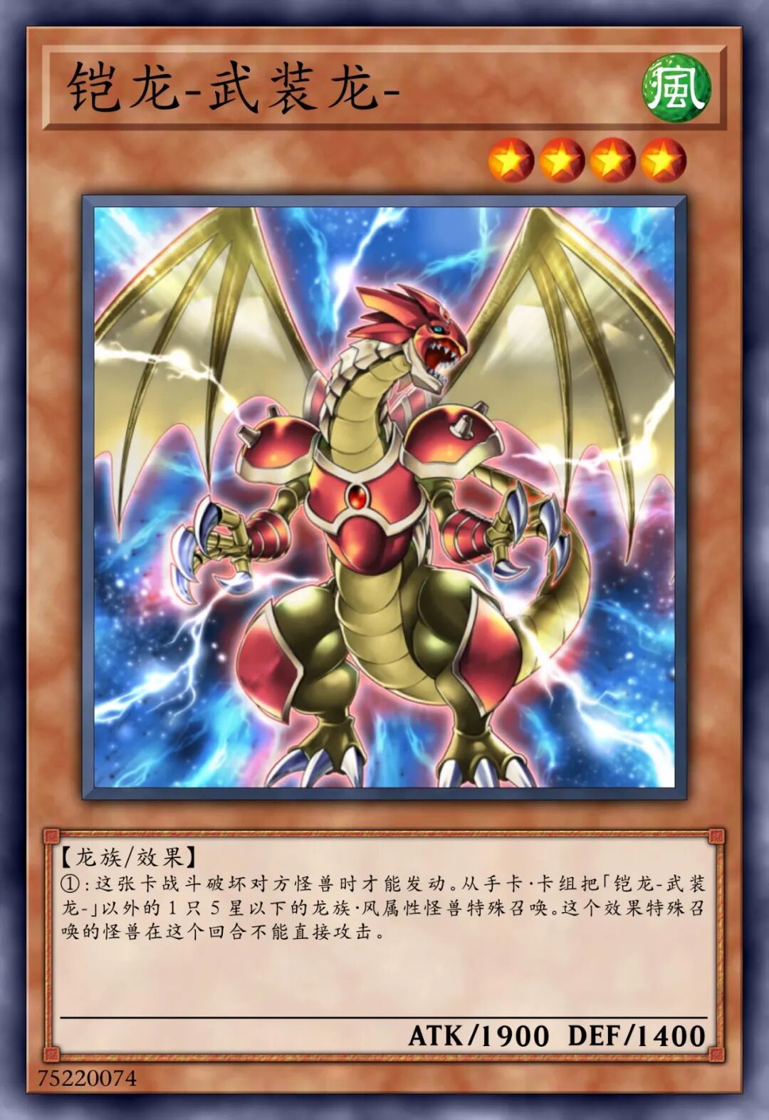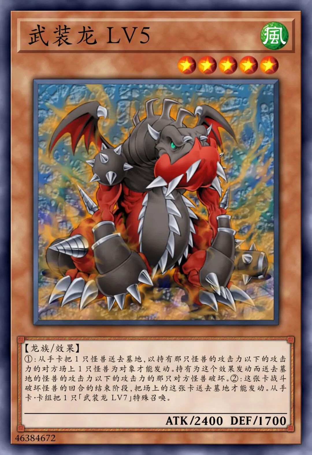 【龙族/效果】①:「武装龙」怪兽的效果特殊召唤的这张卡得到自身的攻击力的以下效果。•1以上:卡名当作「武装龙 LV10」使用。•10以上:这张卡的控制权不可以变更。•100以上:这张卡不会被战斗破坏。•1000以上:对手回合1次,将1张手牌送去墓地,以场上1张其他卡为对象才可以发动。那张卡破坏,自身的攻击力上升1000点。•10000以上:1回合1次,可以发动。将场上的其他卡全部破坏。
