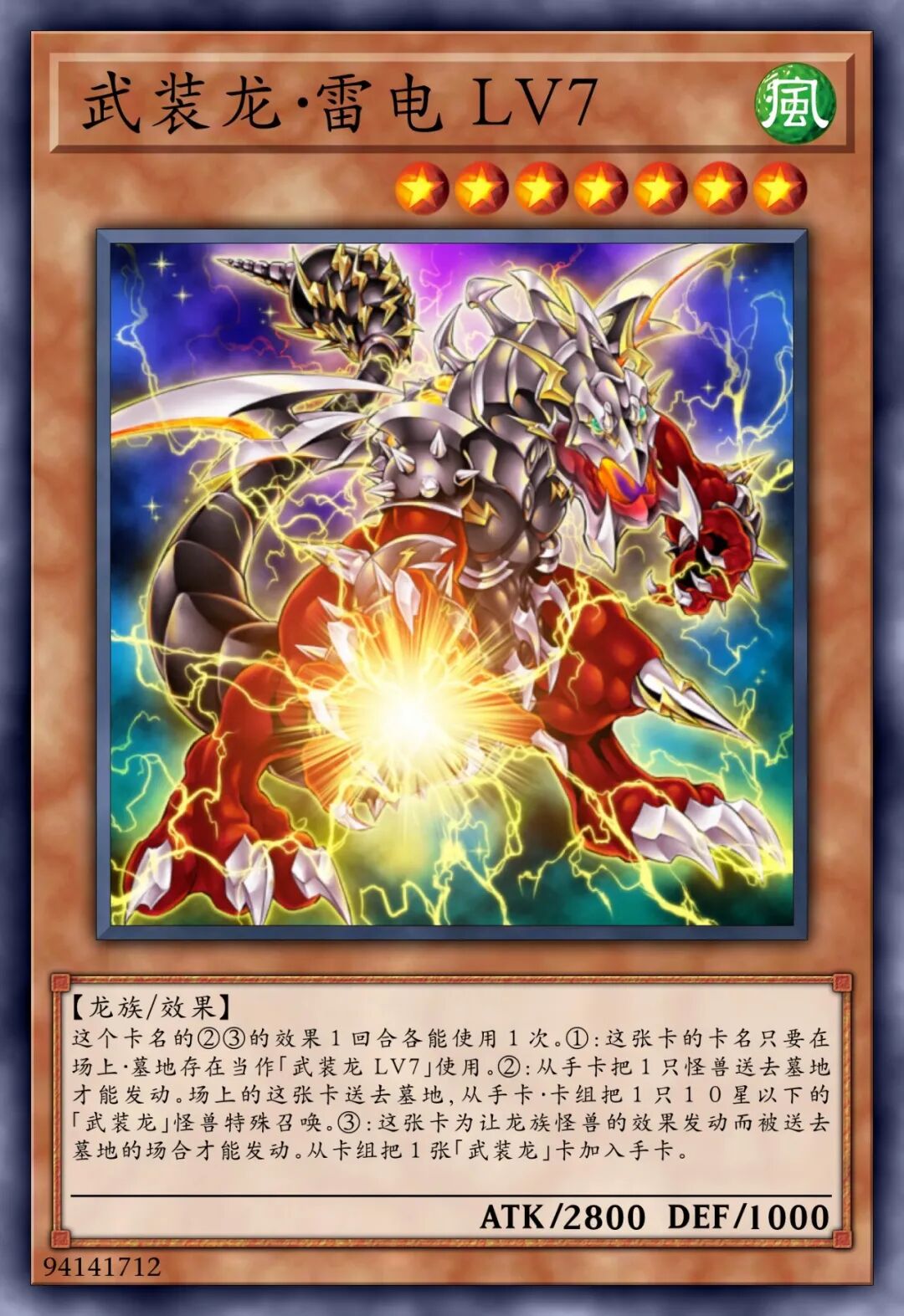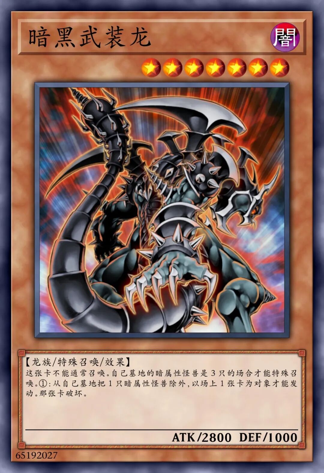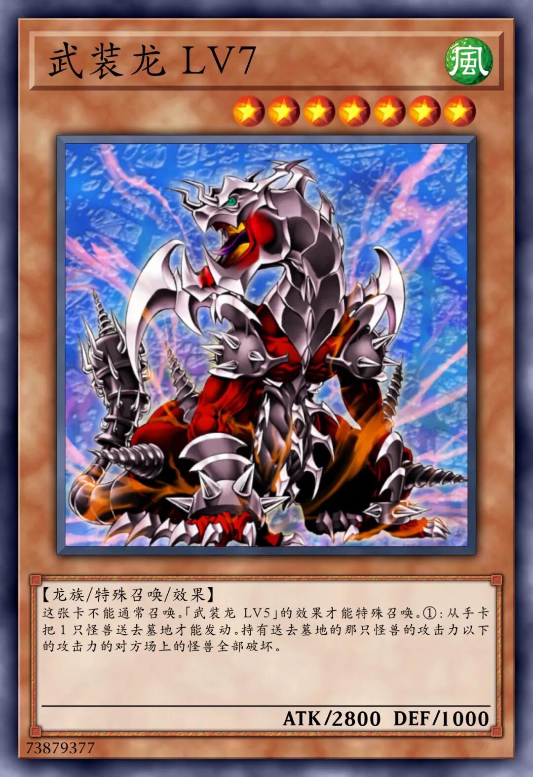 这张卡不能通常召唤,将我方场上1只「武装龙 LV7」解放的场合才可以特殊召唤。①:将1张手卡送去墓地才可以发动。对手场上的表侧表示怪兽全部破坏。