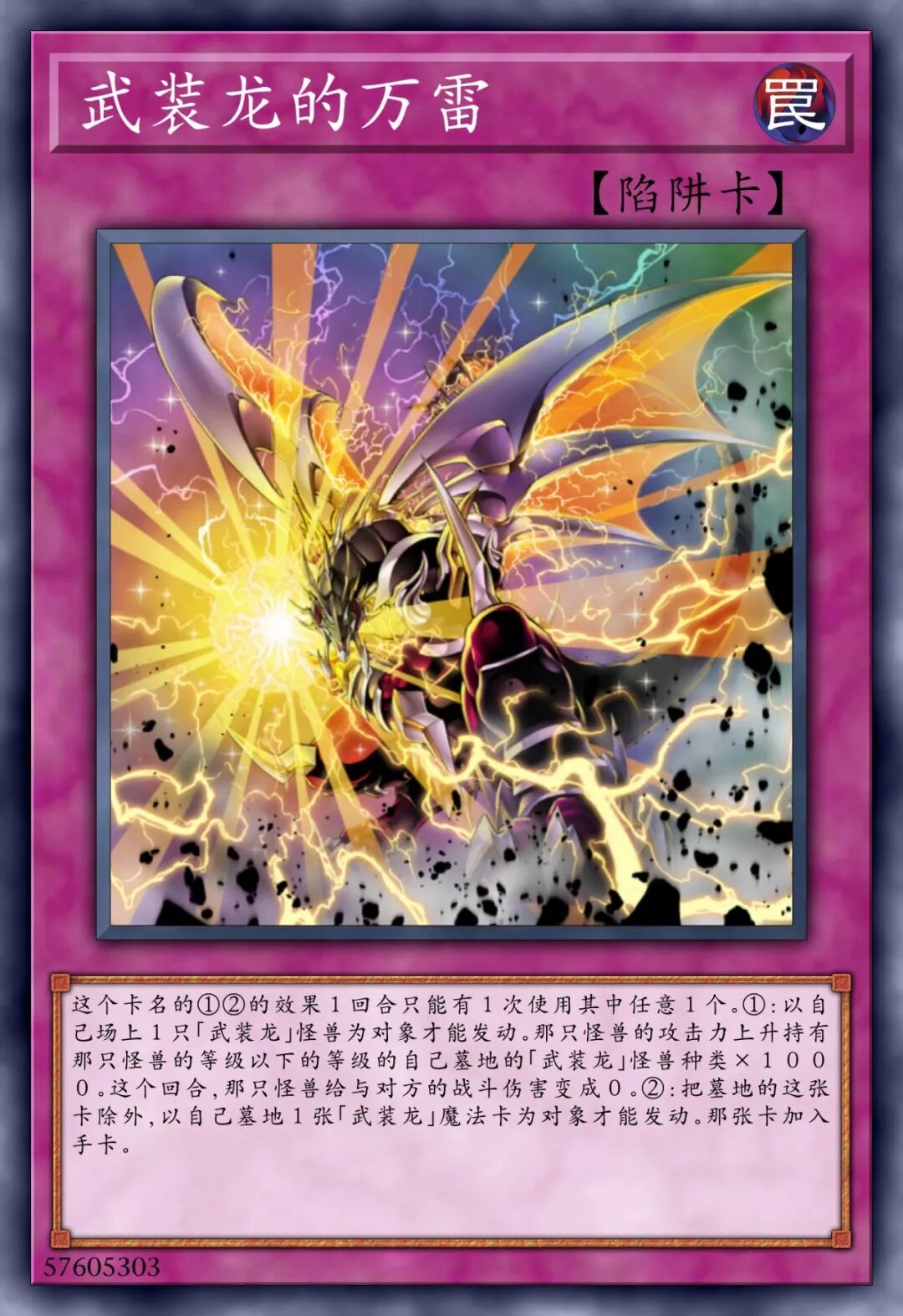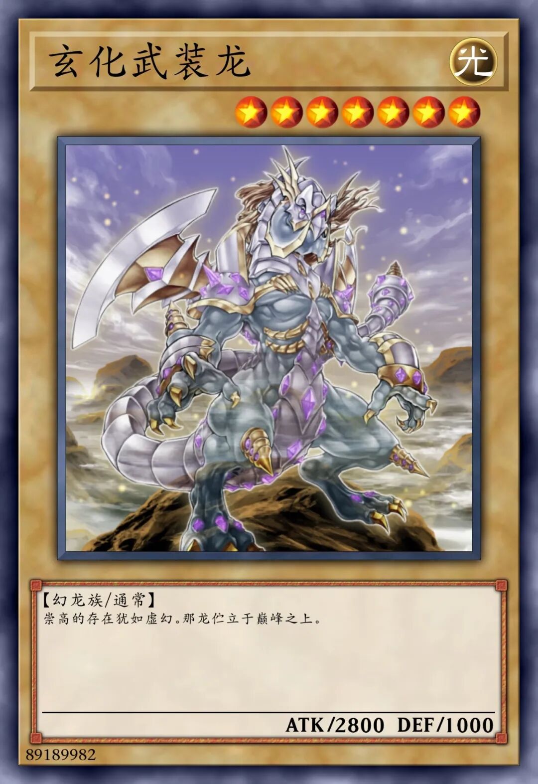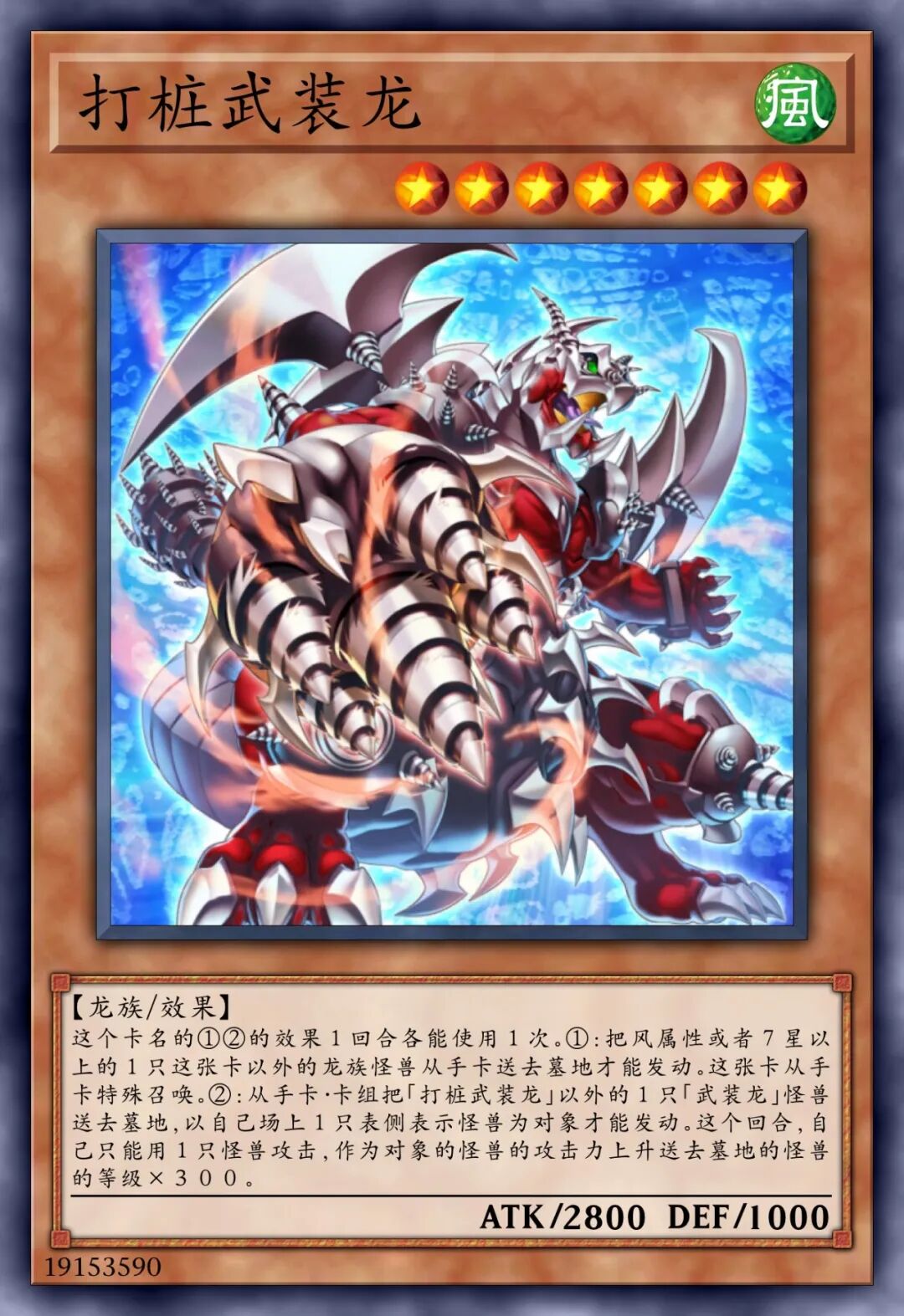 这张卡不能通常召唤,将我方场上1只「武装龙 LV7」解放的场合才可以特殊召唤。①:将1张手卡送去墓地才可以发动。对手场上的表侧表示怪兽全部破坏。