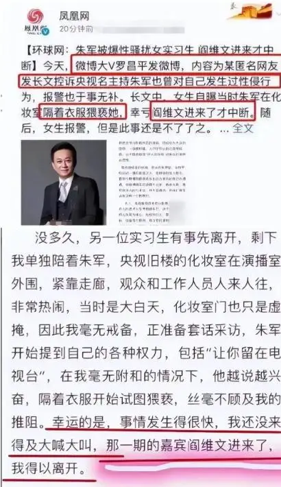 2018年7月,一条爆炸性新闻在网上迅速传播。一个叫弦子的实习生,在网上发了篇长文,声泪俱下地控诉朱军在化妆间对她“动手动脚”,足足有40分钟,最后是阎维文老师推门进来才救了她。