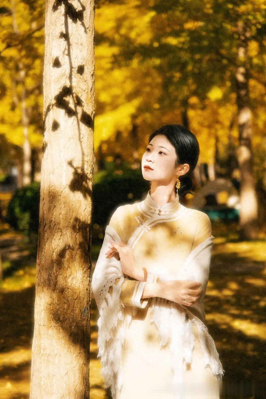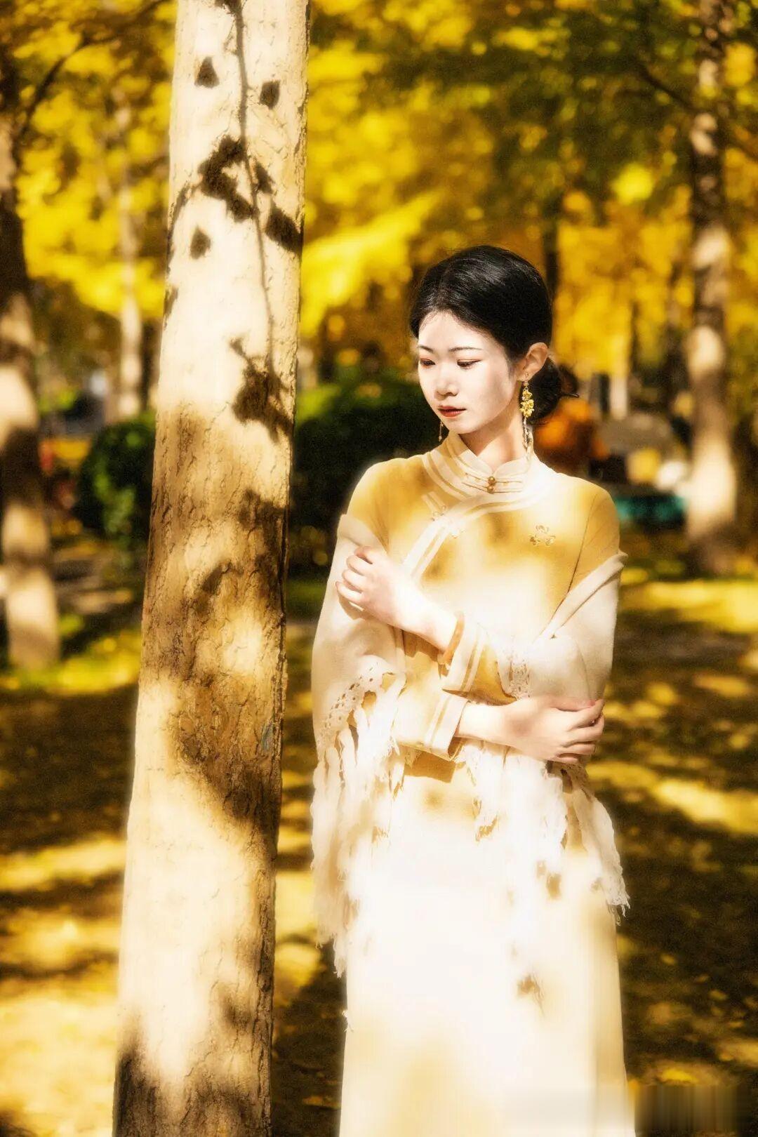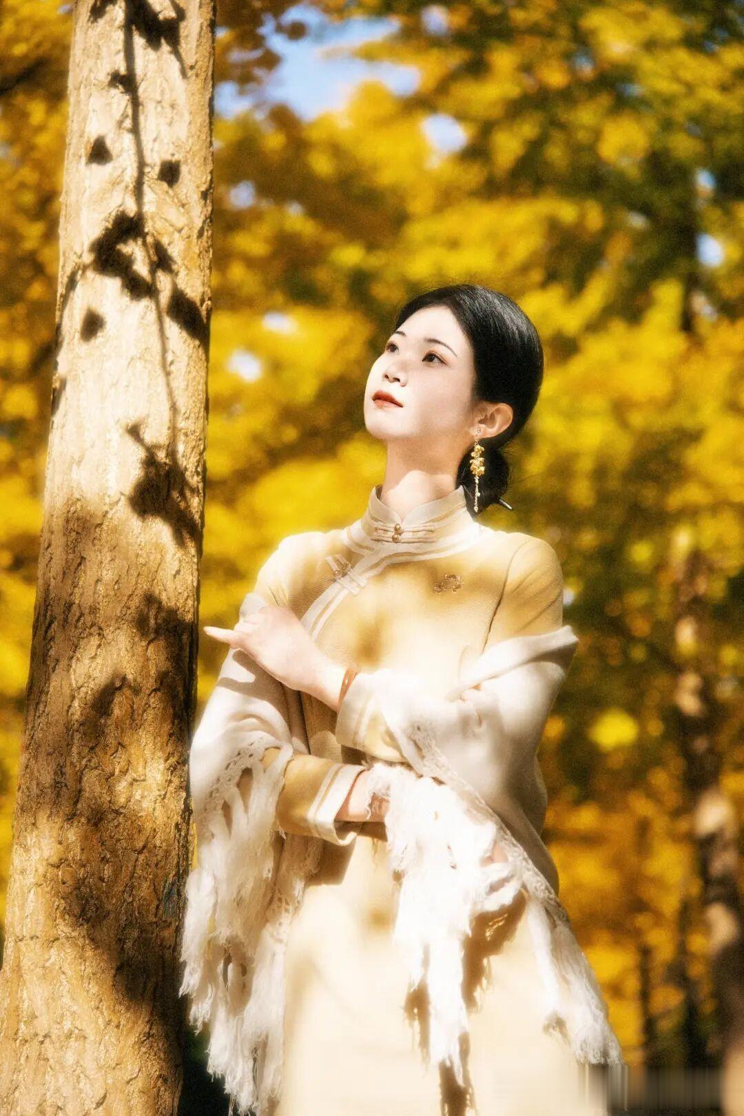 秋日的早晚还是有些凉的,可以在旗袍上搭配一个小披肩,一方面起到保暖的作用,另一方面也可以作为拍照道具。