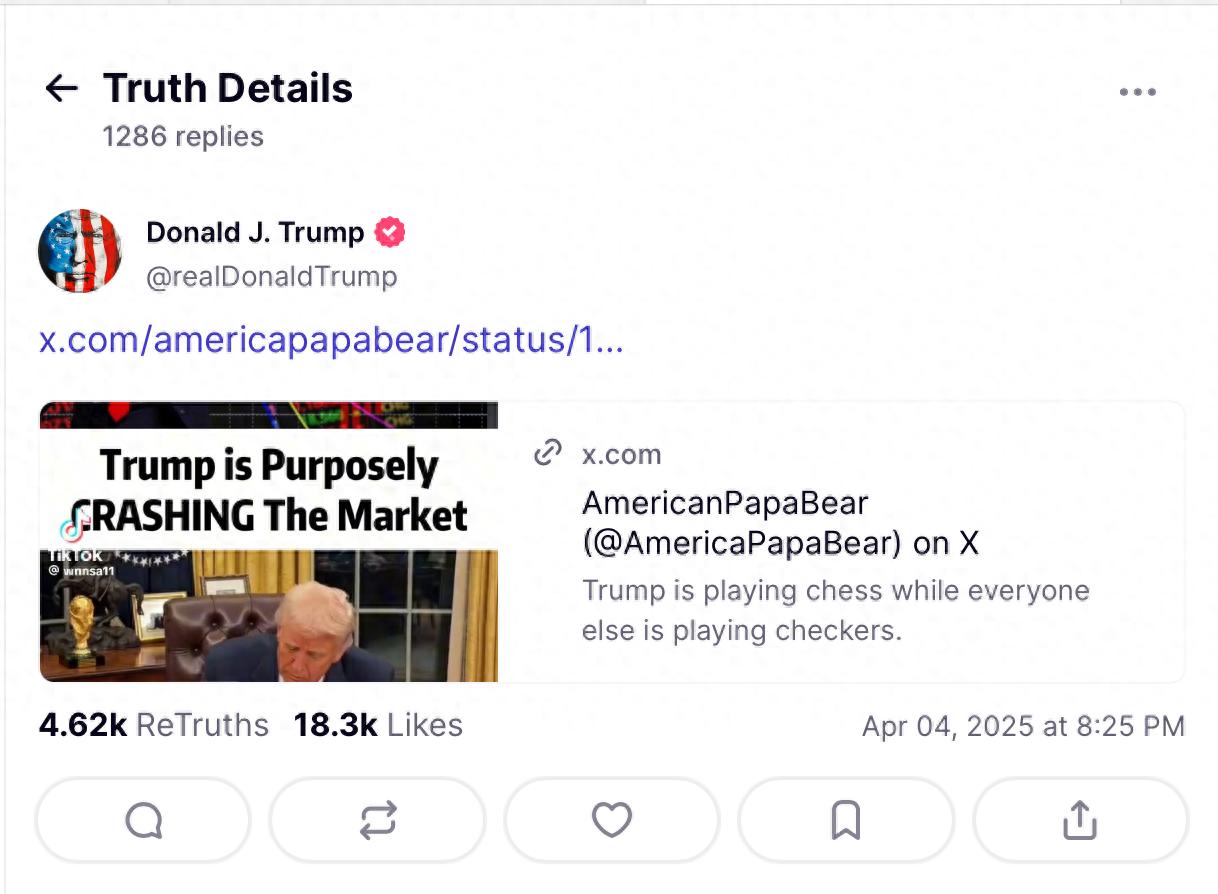 这段被特朗普转发的视频堪称魔幻现实主义的典范。视频开篇直言:"特朗普正在引发股市崩盘…… 但他是故意的。" 这种自曝式的宣言,将总统推上了 "经济操盘手" 的神坛。支持者们将其描绘成 "忍辱负重的改革者",通过制造短期阵痛换取长期繁荣。