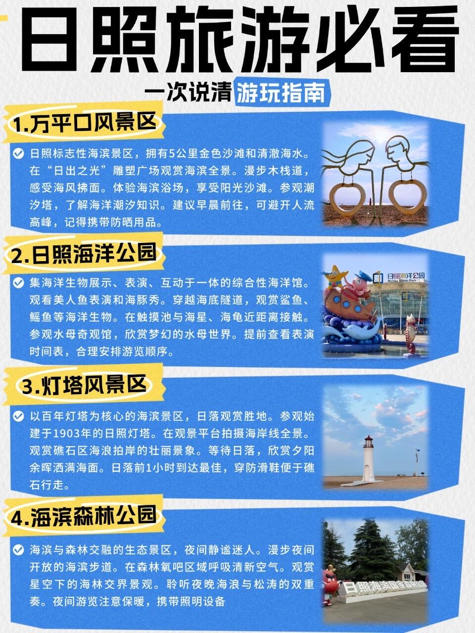 第一天:上午去万平口,金色沙滩几乎没人,海风大但太阳暖和。“日出之光”雕塑那儿看全景巨开阔。一定要走木栈道,巨解压!下午泡在日照海洋公园,室内暖和。傍晚冲灯塔风景区!日落前1小时到,记得穿防滑鞋。天黑后去海滨森林公园,很安静,抬头看星星,绝了!