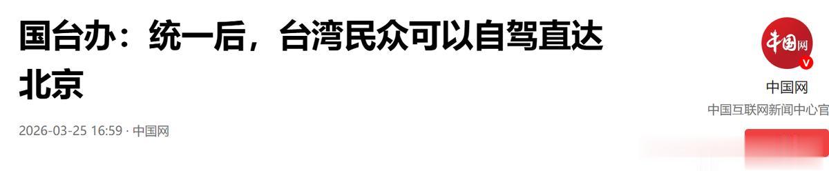 参考资料:中国网——国台办:统一后,台湾民众可以自驾直达北京2026-03-25