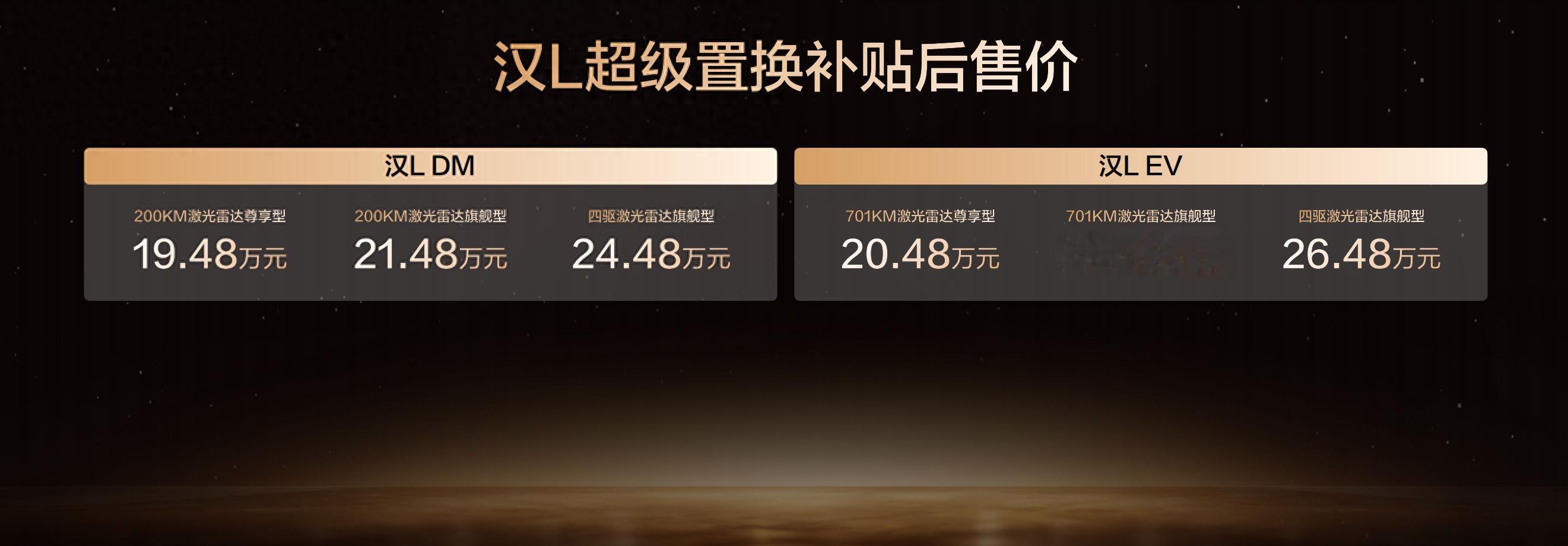 此次,汉L EV共带来3款车型,补贴后售价20.48万~26.48万元;汉L DM 3款车型,补贴后售价19.48万~24.48万元;同时,比亚迪还为用户准备了包含置换补贴在内的至高价值5.2万元尊享礼遇。(以上权益截至12月31日)