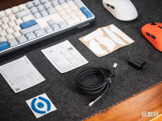 配件清单必须重点夸,1.8米长的8K高速数据线(还是镀金USB-C接口,抗干扰性更强)、nano级8K接收器、USB转接器,甚至还送了99.95%高纯度特氟龙备用脚贴和按键防滑贴,要知道这俩配件在别家基本都是单独付费的,汗手玩家懂的都懂,防滑贴简直是刚需。
