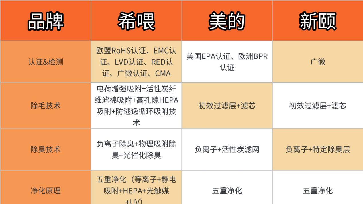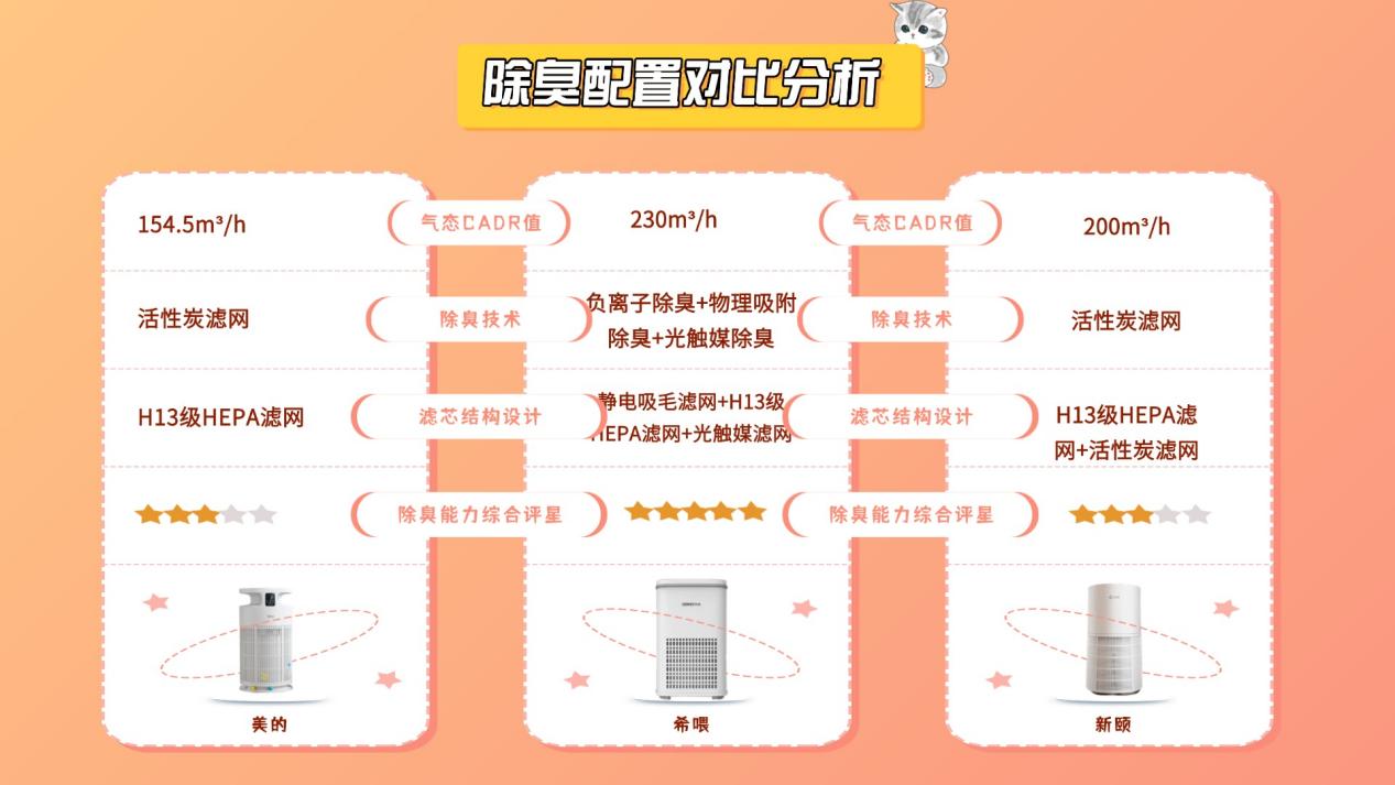 宠物空气净化器除猫毛哪个牌子好?除臭能力排序为:希喂 > 新颐 > 美的。