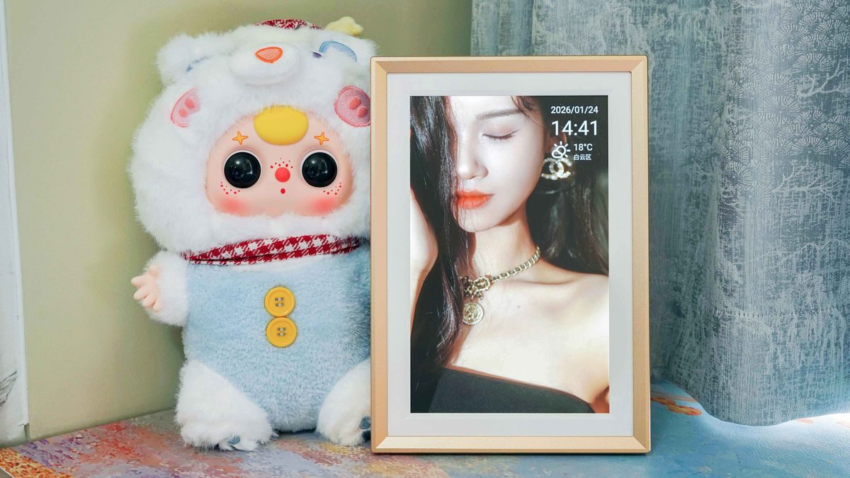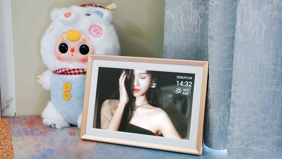 在厚度上,它真的藏着满满的巧思 —— 机身做了超薄一体化设计,边缘收得利落又精致,整体厚度和我家的传统相框几乎没差别,摆在桌面完全不占地儿,不会像有些数码相框那样鼓鼓囊囊,破坏新房的整洁感。