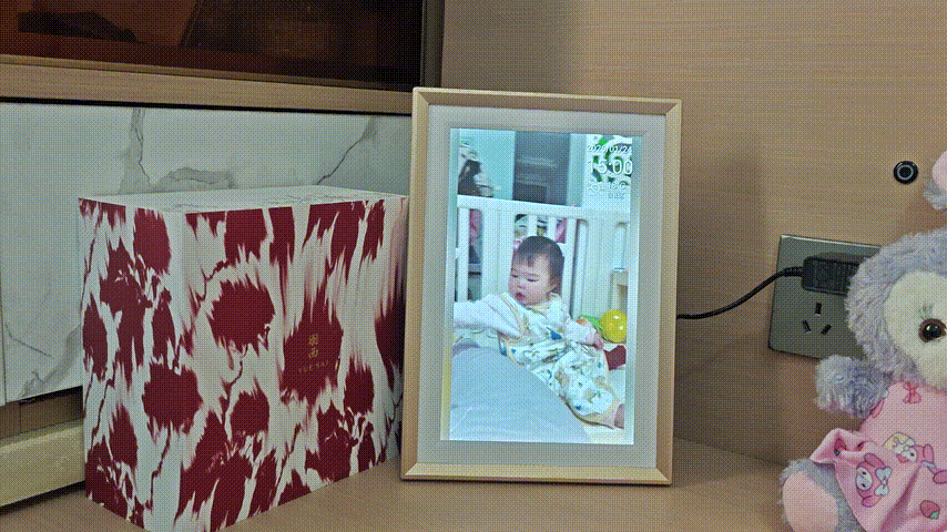 触控操作也很灵敏,像用手机一样顺滑,轻轻一点就能切换照片、调节亮度。有时候我们带着孩子在客厅玩,随手点开相框里的音乐视频,孩子会跟着节奏晃悠小身子,相框就成了 “亲子互动神器”。最有趣的是,我们上传了孩子自己的照片,他看到屏幕里的小不点,会伸出小手去摸,嘴里还咿咿呀呀地念叨,那模样逗得我们哈哈大笑,让新房里满是欢声笑语。