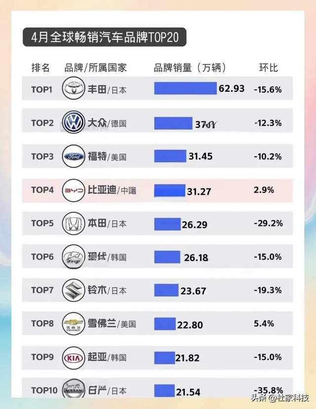 也就是说,相信用不了多久,比亚迪就能够“突飞猛进”,进入全球车企销量榜第三名。