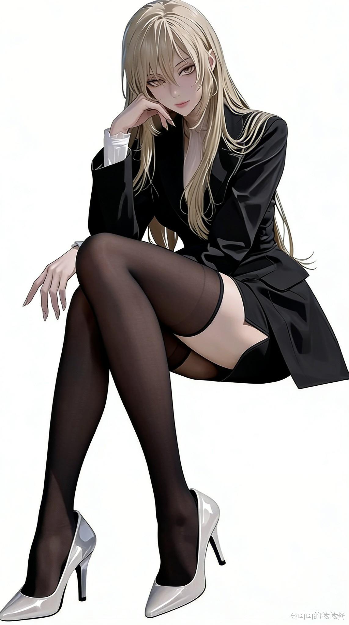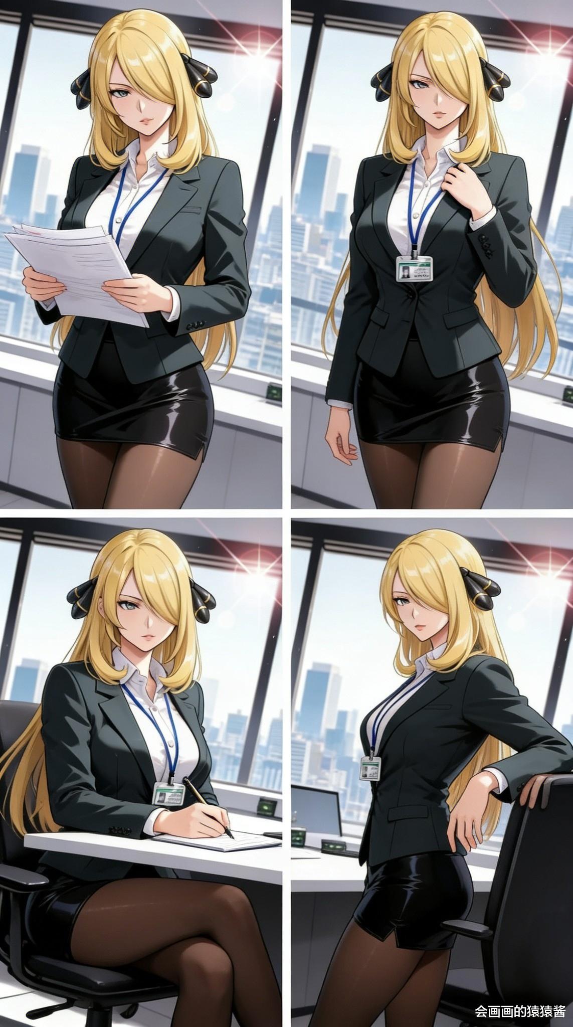 (竖版多格构图),二次元女性,浅金长直发,黑色西装套裙(内搭白色V领衬衫),黑色尖头高跟鞋,多组姿态(插兜站立/靠墙俯身/撑桌弯腰/趴桌休憩),纯白色背景,柔和均匀布光,细腻面料质感,高清8K,写实插画风格。