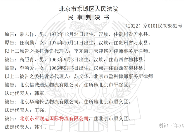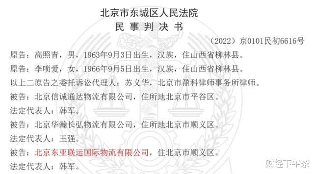 北京信诚通达物流有限公司(下称信诚通达)、北京华瀚长弘物流有限公司(下称华瀚长弘)、北京东亚联运国际物流有限公司(下称北京联运)均为世盟股份的全资子公司。(2022)京0101民初8852号、(2022)京0101民初6616号两份判决文书均为同一个交通事故的两份判决结果,事故经过如下: