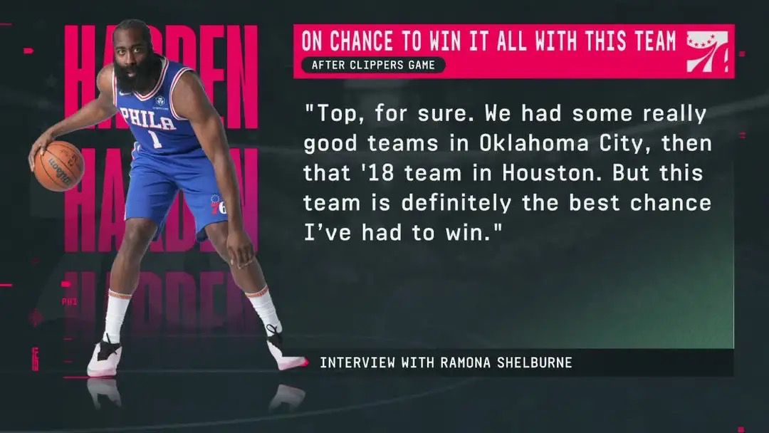 其实火箭究竟能不能签回哈登,哈登其实已经表达的很明确了,最近他在接受采访的时候表示,在76人的这个赛季,是他距离总冠军最近的一个赛季,这个赛季的机会甚至高于曾经的雷霆和18年的火箭!哈登的历史地位之所以迟迟没有提升,不就是因为没有冠军吗?无论怎么来看,76人似乎都是追逐总冠军的最好的地方!