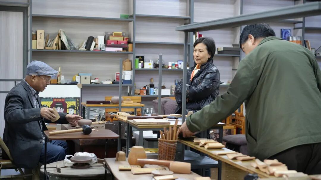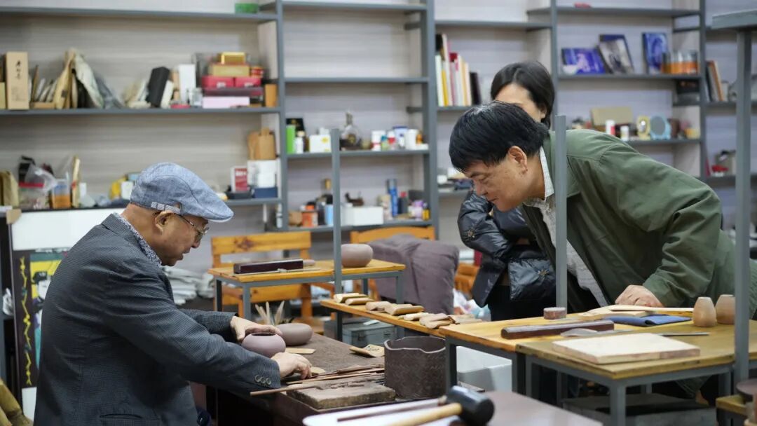 午后,葛韬先生陪同姜院长一行步入自己的工作室。室内书籍层叠,做壶工具依序静列,宛如一行行凝固的诗。阳光斜落于紫砂工具与半成器皿之间,葛韬随手拈起一把尚在修整的壶坯,指尖抚过流、把、钮之间,话音温和如陶土般沉实:“一捧紫泥,须经数十道工序,方得不燥不腻。古人制器,心手相连——我们手艺人留存的不是标本,是手势与温度。”众人驻足细观,仿佛看见时间在指间被重新揉捏、延展,古法并非旧籍中的字句,而是呼吸在此刻的掌心。