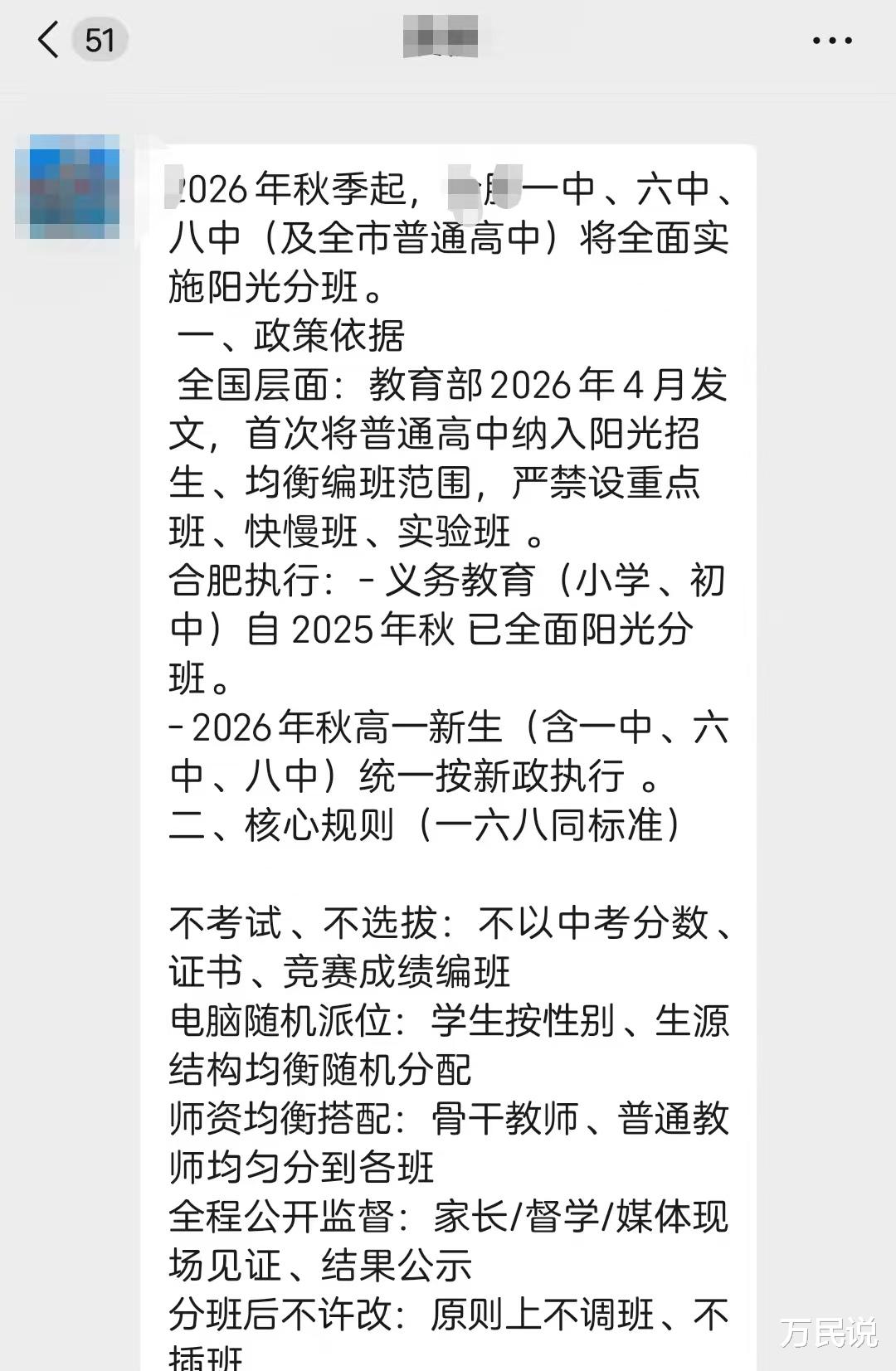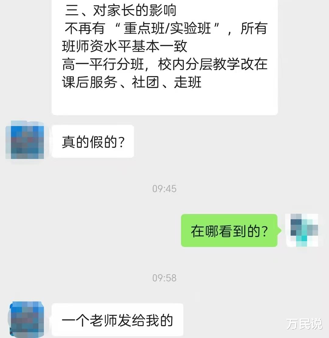我们赶紧翻出家长发过来的信息,仔细读了三遍。信息很长,核心就一句:今年9月的新高一,无论中考成绩高低,只要进了同一所高中,就不再分什么强基班、实验班、素养班——大家都一样,都是普通班。