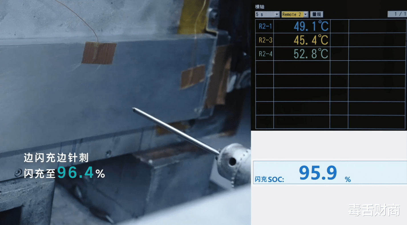 那为什么比亚迪敢做出这样的承诺呢?原因很简单,他们的第2代刀片电池不仅充电速度快,最关键是很耐充,之前他们曾经做过一个核心安全测试,在测试中,这款电池完成500次闪充循环(这个充电强度相当于行驶30万公里),然后他们还边充边针刺,但整个过程却没有出现热失控,也没有冒烟,没有起火,没有爆炸,这种安全标准远超国标300次快充循环后的测试要求。