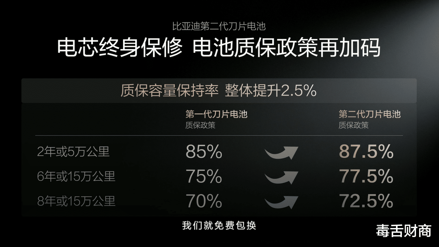 面对质疑,比亚迪这回真的豁出去了,按照他们质保新政,对于第2代刀片电池,在6年或15万公里质保期内,电池容量保持率标准由75%进一步提升到77.5%,如果质保期内容量低于该标准,用户即可以享受免费包换服务,另外第2代刀片电池电芯更是实现终身保修。