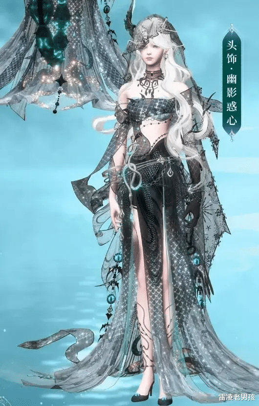 女款服饰呈现出妩媚冷艳的风格,半透明的蕾丝头纱轻柔地覆在发间,增添了几分神秘的韵味。颈部的饰链好似盘绕的蛇身,于冷冽之中透露出一丝妖异之感。特别是那条表面带有奇特诡异纹路的饰链,看上去犹如蛇鳞一般,不禁让人胆寒,仿佛能看穿面前这位美人外表下那颗狡黠又冷酷的内心。