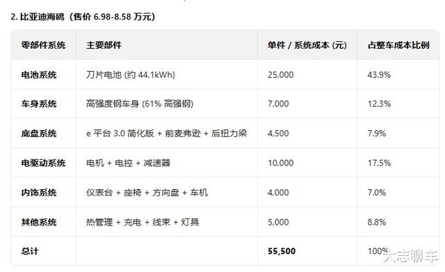 而且对于车主来说,低端走量车还有个好处,那便是修车更便宜,不开玩笑的说,车企因为走量,使得整车成本会跟着大幅度降低,零配件成本也会跟着降下来,我整理了一张表格,我们以比亚迪的海鸥为例,他的整车零配件成本加起来也才5.55万,哪怕你把全车都给换了,你会发现,成本也就那么一回事,最起码车主修车不会很贵。